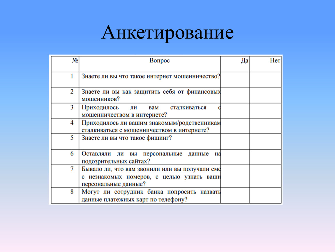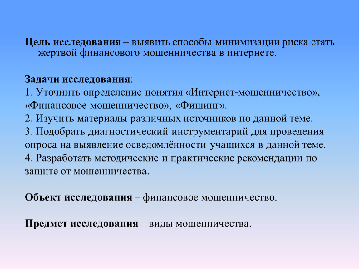 Цель исследования – выявить способы минимизации риска стать жертвой финансового мошенничества в интернете.