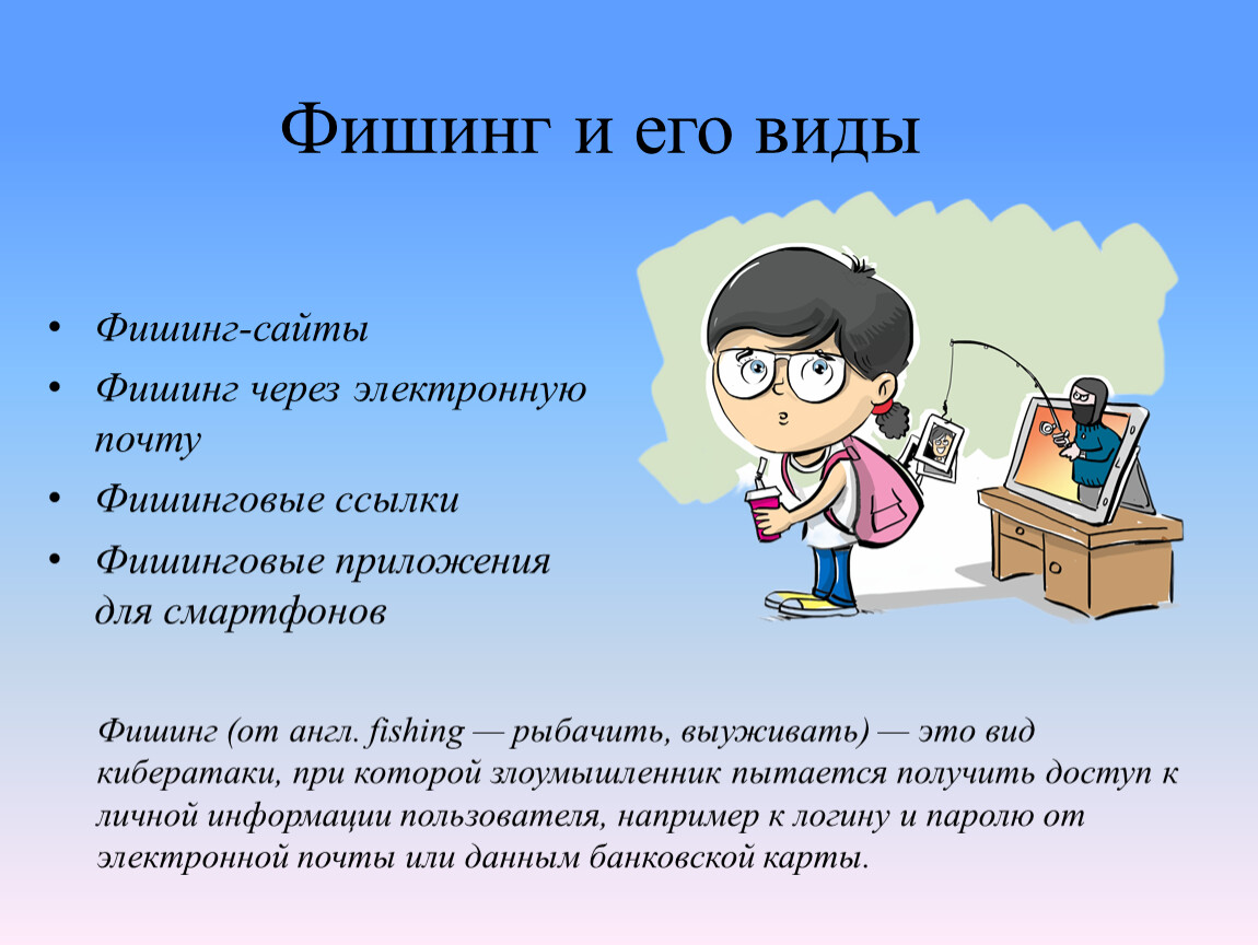 Фишинг (от англ. fishing — рыбачить, выуживать) — это вид кибератаки, при которой злоумышленник пытается получить доступ к личной информации пользователя, например к логину и паролю от электронной почты или данным банковской карты.