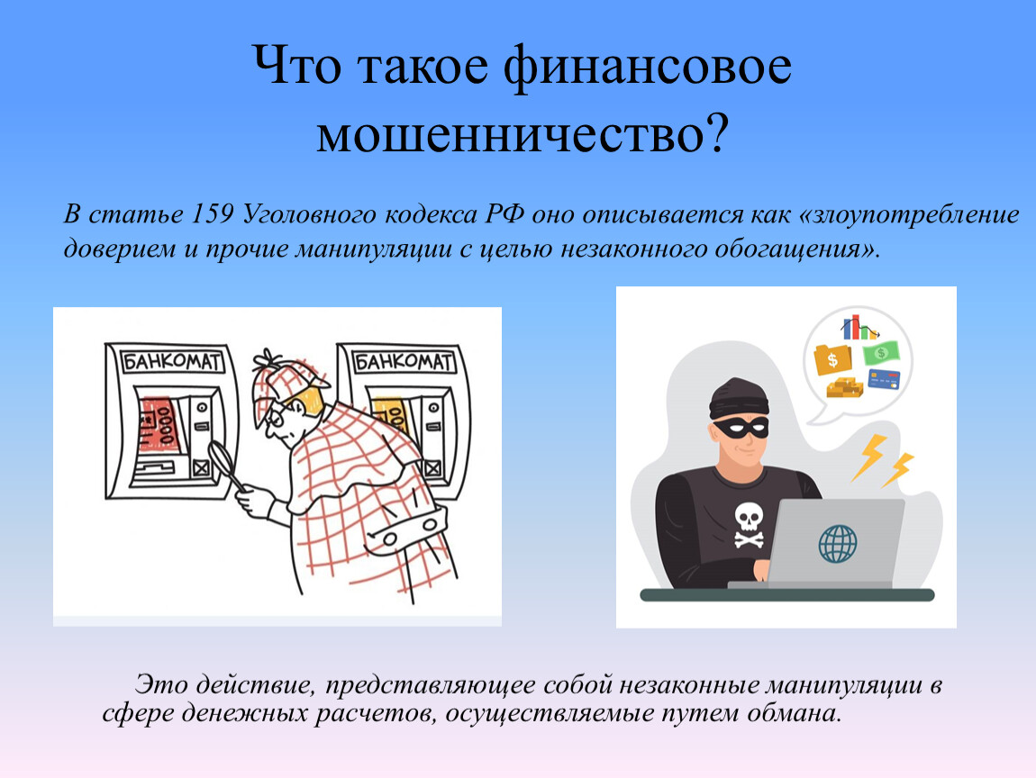 В статье 159 Уголовного кодекса РФ оно описывается как «злоупотребление доверием и прочие манипуляции с целью незаконного обогащения».