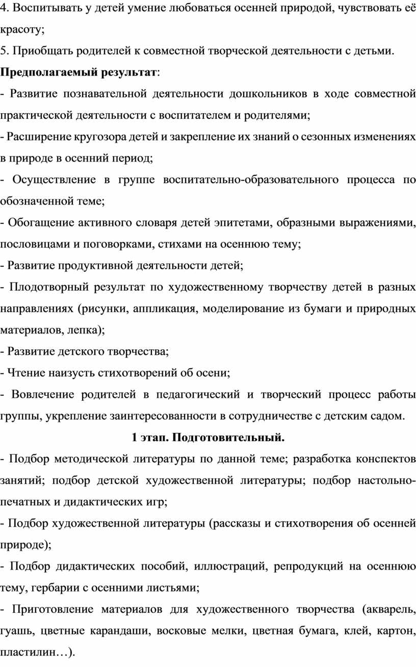 Актуальность: Данный проект позволяет в условиях воспитательно-образовательного процесса расширить и укрепить знания детей о сезонных изменениях в природе в осенний период, и применения приобретённых знаний с творческим подходом в практической изобразительной деятельности, развивать при этом познавательные, коммуникативные и творческие способности детей.
