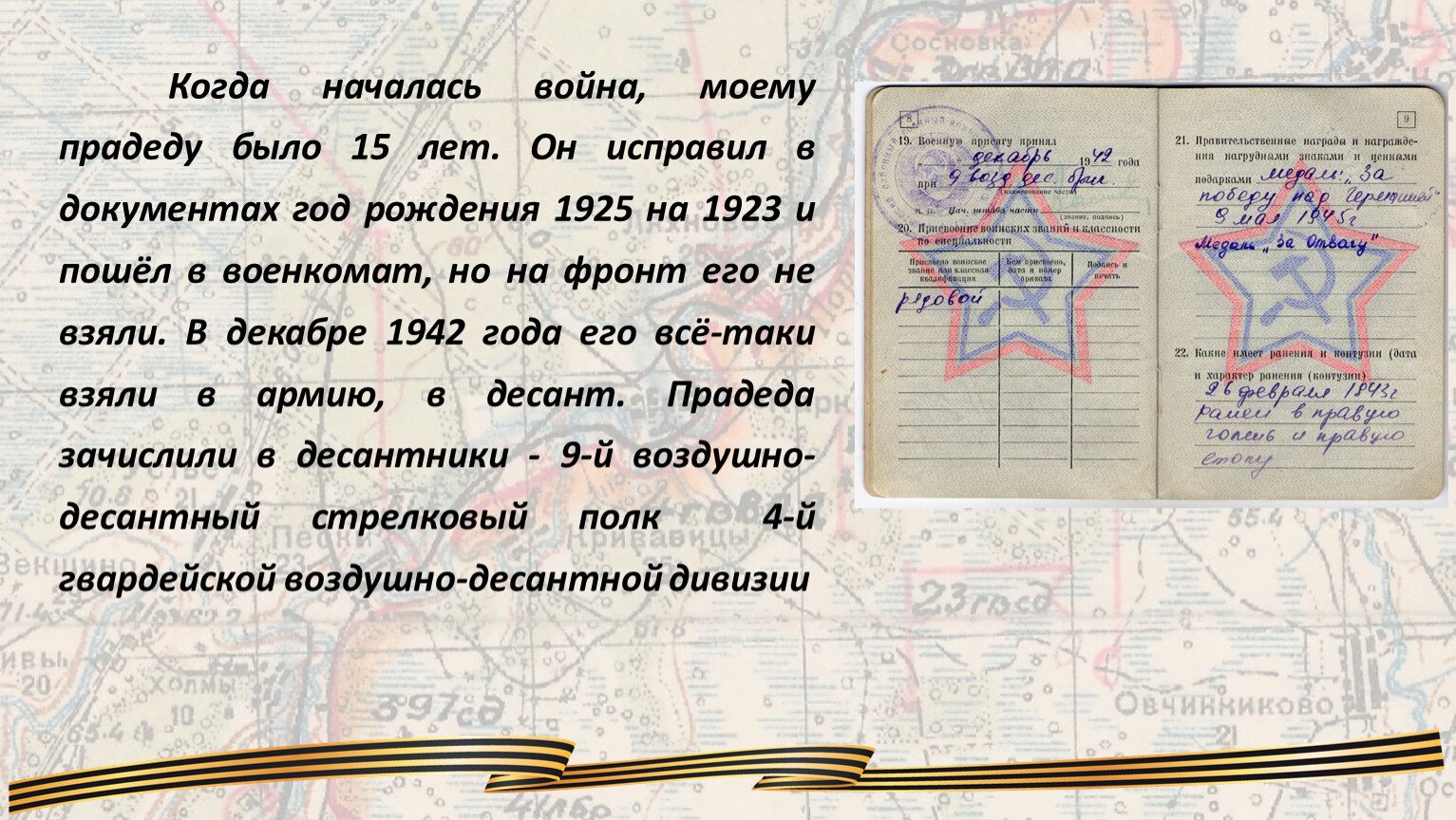 Когда началась война, моему прадеду было 15 лет. Он исправил в документах год рождения 1925 на 1923 и пошёл в военкомат, но на фронт его не взяли. В декабре 1942 года его всё-таки взяли в армию, в десант. Прадеда зачислили в десантники - 9-й воздушно-десантный стрелковый полк 4-й гвардейской воздушно-десантной дивизии