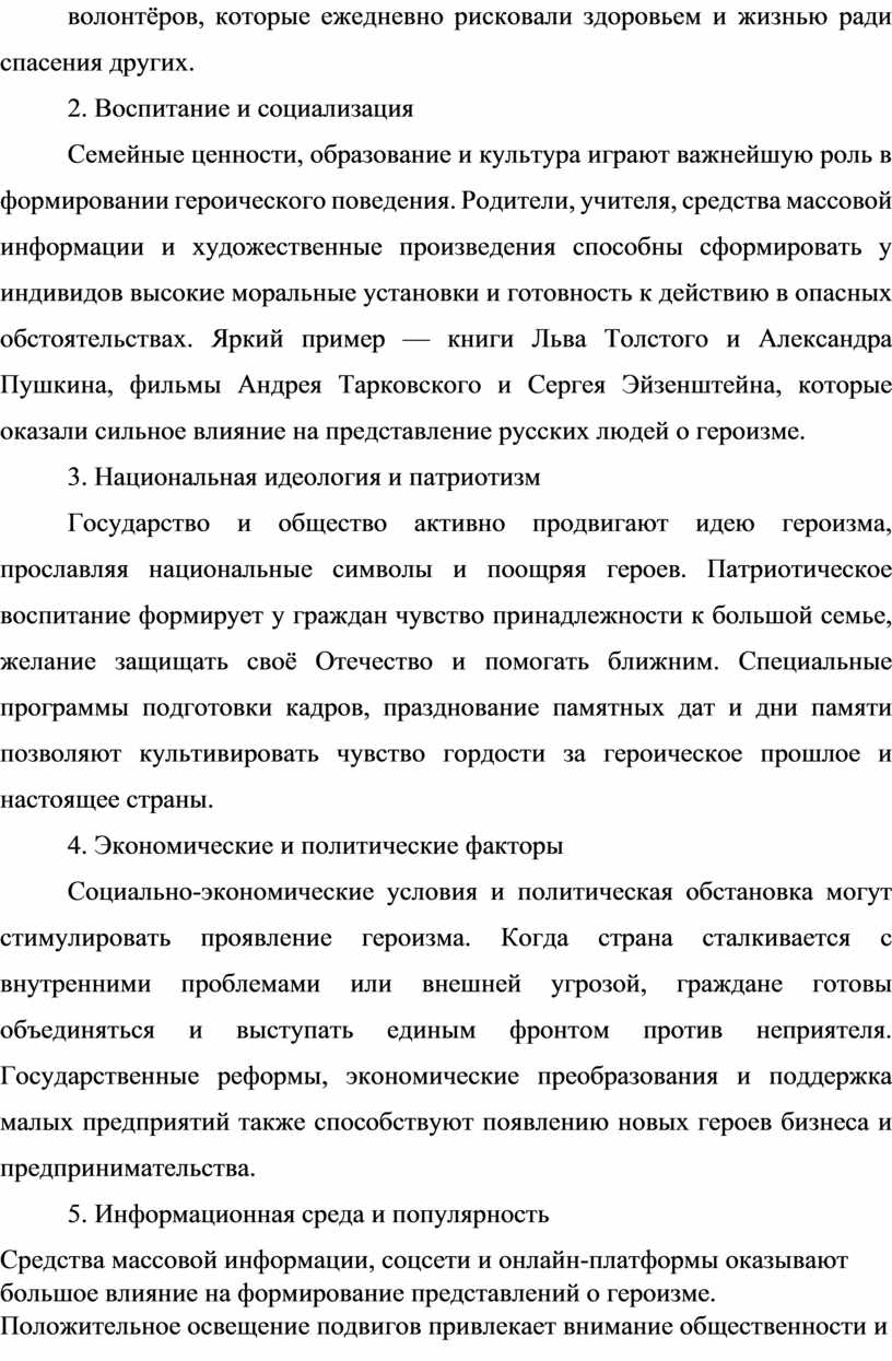 Социально-экономические условия и политическая обстановка могут стимулировать проявление героизма. Когда страна сталкивается с внутренними проблемами или внешней угрозой, граждане готовы объединяться и выступать единым фронтом против неприятеля. Государственные реформы, экономические преобразования и поддержка малых предприятий также способствуют появлению новых героев бизнеса и предпринимательства.