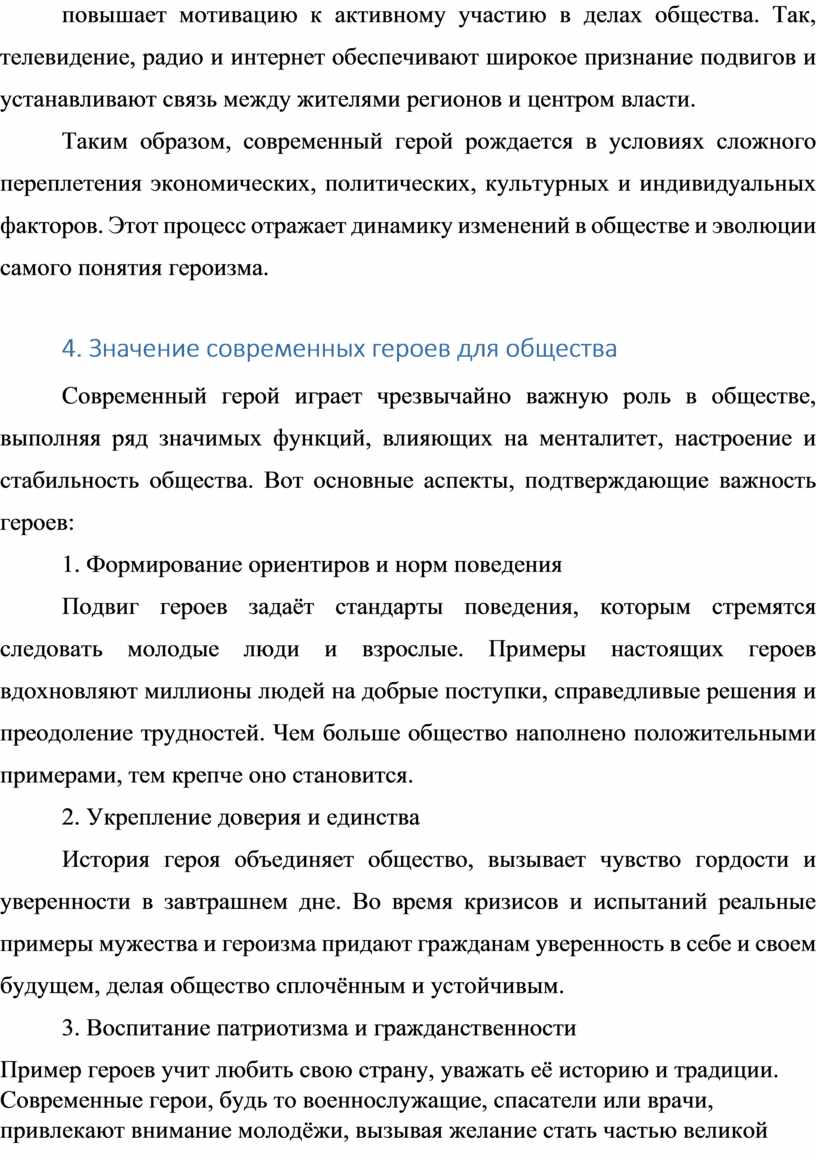 Таким образом, современный герой рождается в условиях сложного переплетения экономических, политических, культурных и индивидуальных факторов. Этот процесс отражает динамику изменений в обществе и эволюции самого понятия героизма.