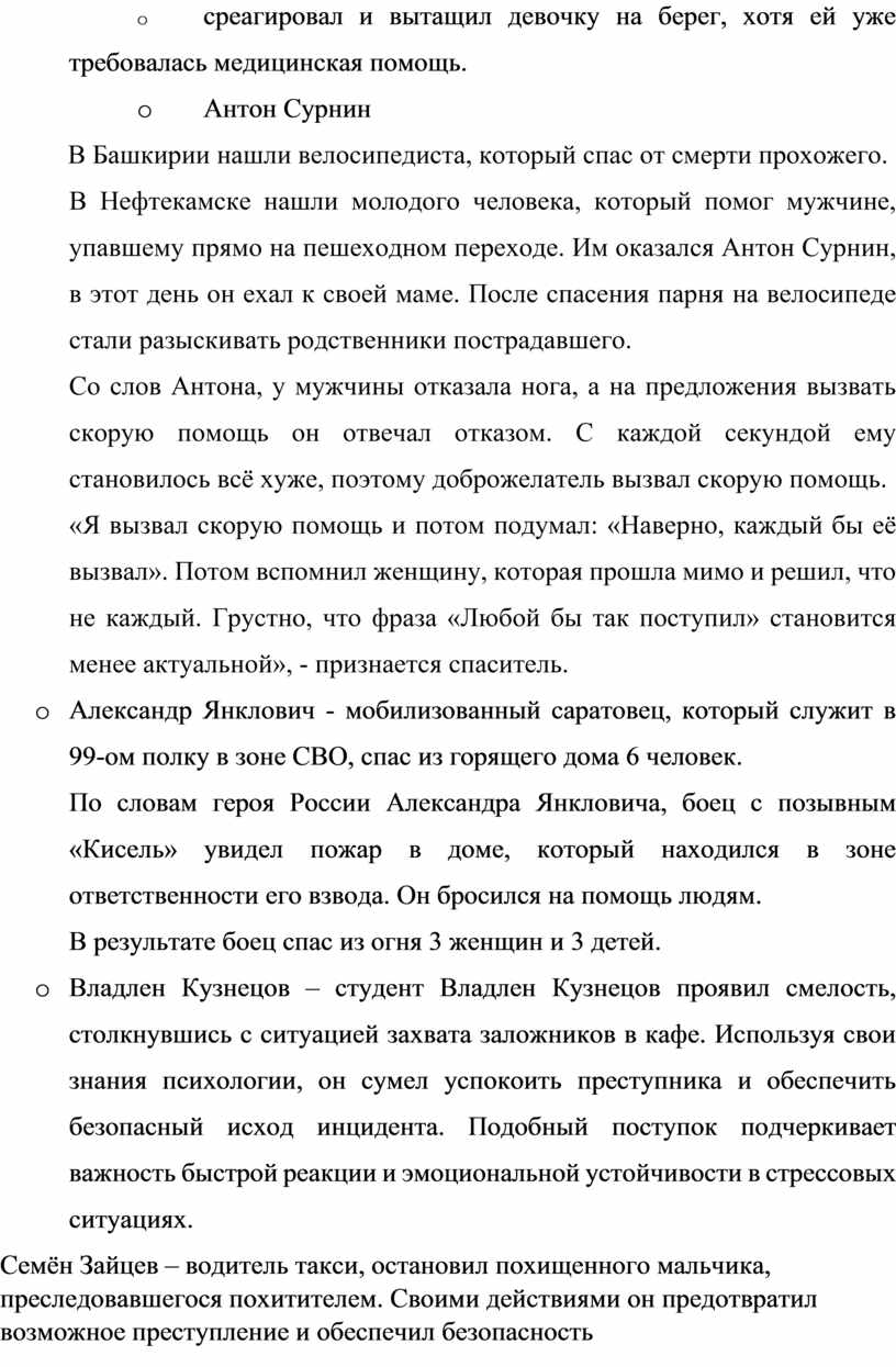 o Семён Зайцев – водитель такси, остановил похищенного мальчика, преследовавшегося похитителем. Своими действиями он предотвратил возможное преступление и обеспечил безопасность несовершеннолетнего. Такой поступок напоминает о том, что любая профессия может стать платформой для совершения героических деяний.