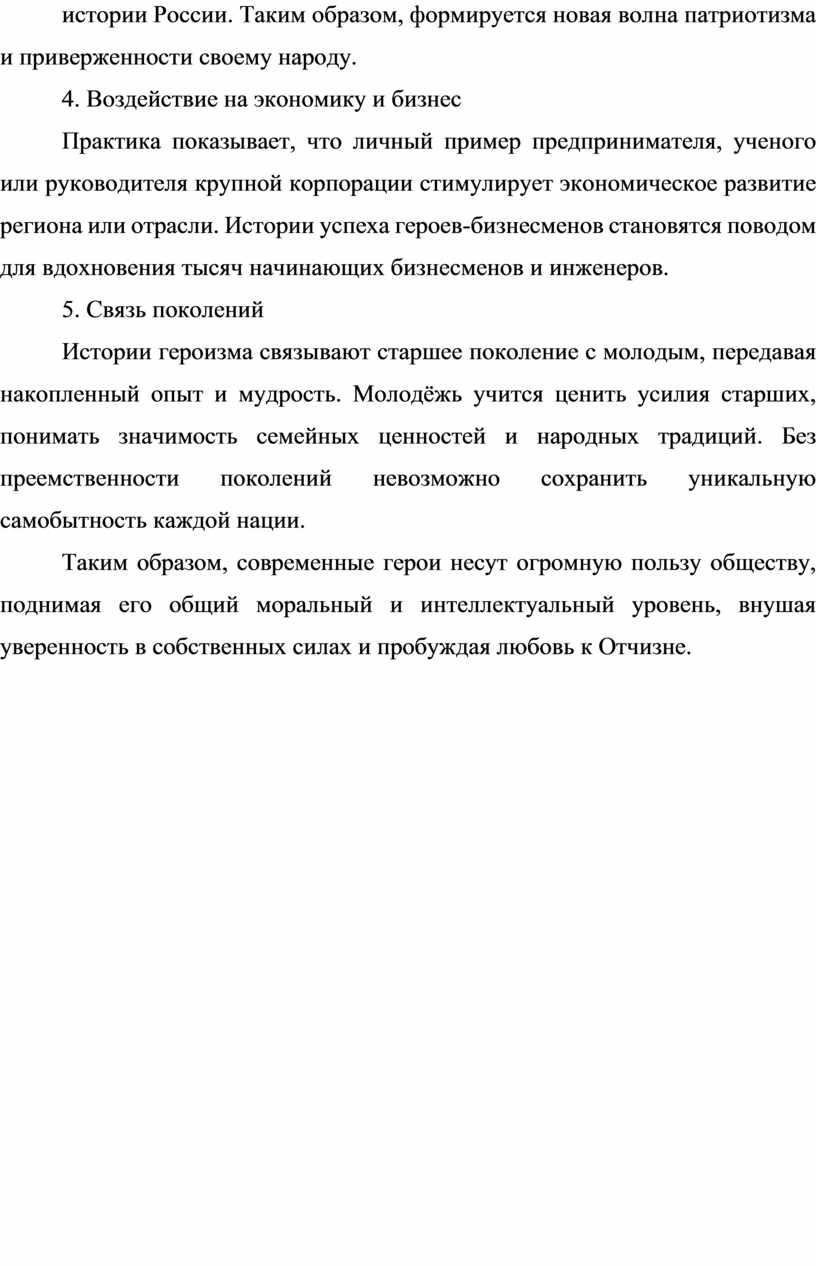 Таким образом, современные герои несут огромную пользу обществу, поднимая его общий моральный и интеллектуальный уровень, внушая уверенность в собственных силах и пробуждая любовь к Отчизне.