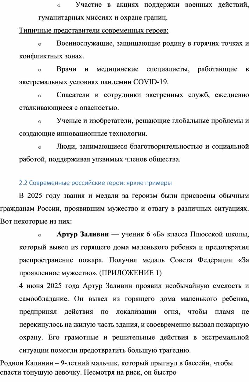 Современная Россия богата примерами мужества, смелости и благородства, воплощёнными в жизнях её героев. Каждый день находятся люди, готовые рискнуть собственной жизнью ради спасения других, защиты родины и сохранения мира. Такие личности становятся символами человеческого духа, справедливости и доброты, оказывая огромное влияние на общество и молодёжь. Настоящая исследовательская работа посвящена исследованию современных героев России, раскрытию их характерных черт и поступкам, ставших знаковыми для всего российского народа.