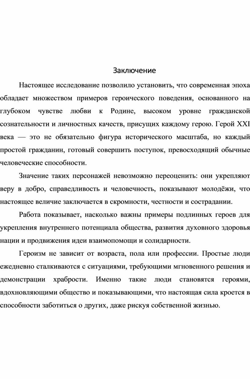 Настоящее исследование позволило установить, что современная эпоха обладает множеством примеров героического поведения, основанного на глубоком чувстве любви к Родине, высоком уровне гражданской сознательности и личностных качеств, присущих каждому герою. Герой XXI века — это не обязательно фигура исторического масштаба, но каждый простой гражданин, готовый совершить поступок, превосходящий обычные человеческие способности.