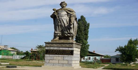 Скульптура украинского гетмана установлена в историческом центре города в честь 300-летия вступления Украины в состав России. Именно Хмельницкий способствовал воссоединению двух народов.