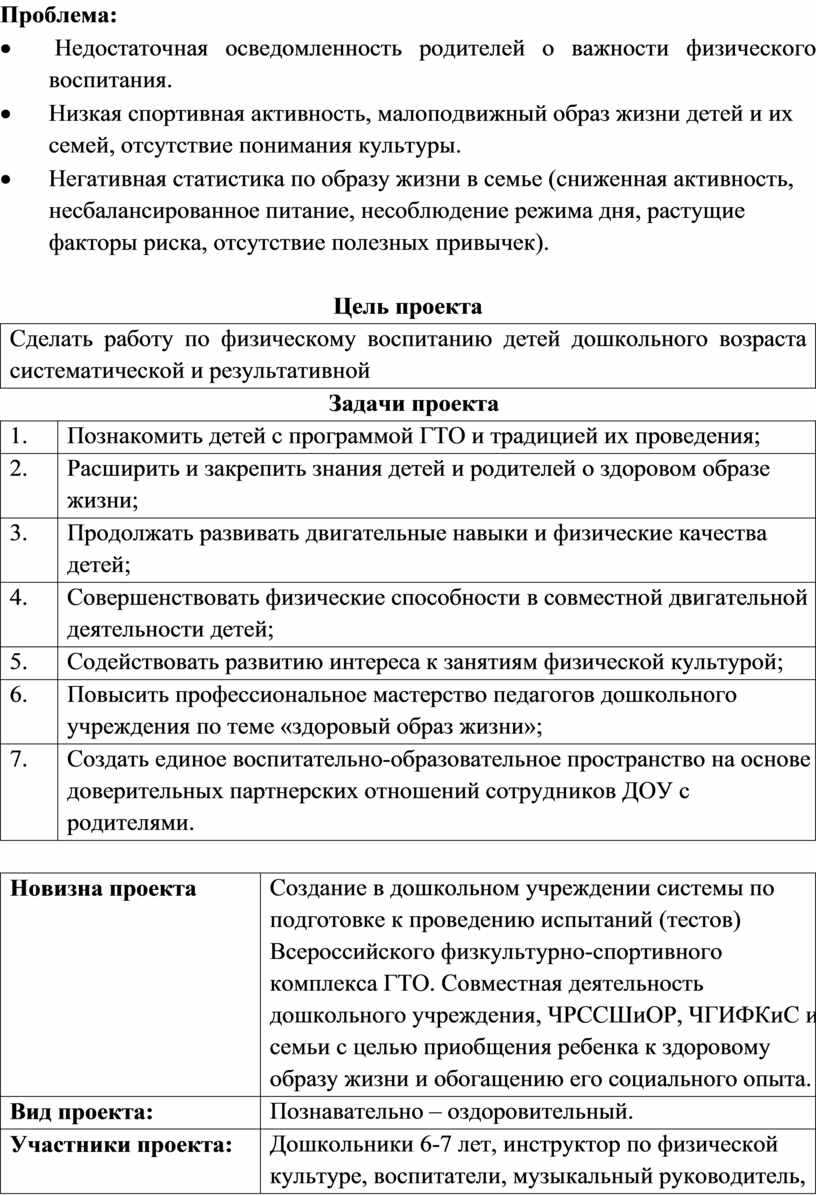 Создание в дошкольном учреждении системы по подготовке к проведению испытаний (тестов) Всероссийского физкультурно-спортивного комплекса ГТО. Совместная деятельность дошкольного учреждения, ЧРССШиОР, ЧГИФКиС и семьи с целью приобщения ребенка к здоровому образу жизни и обогащению его социального опыта. |