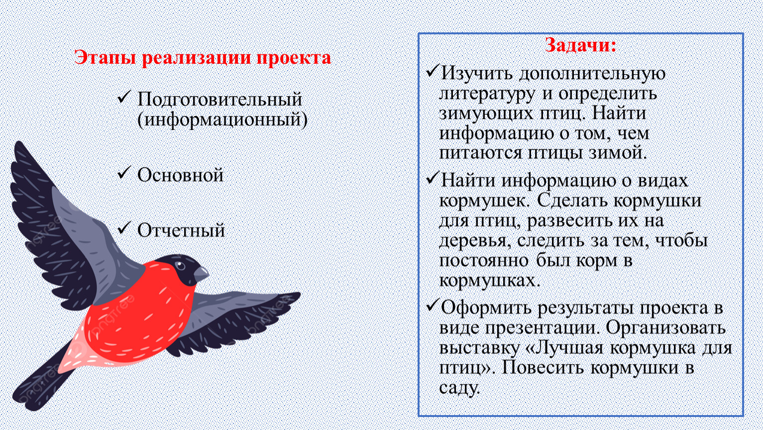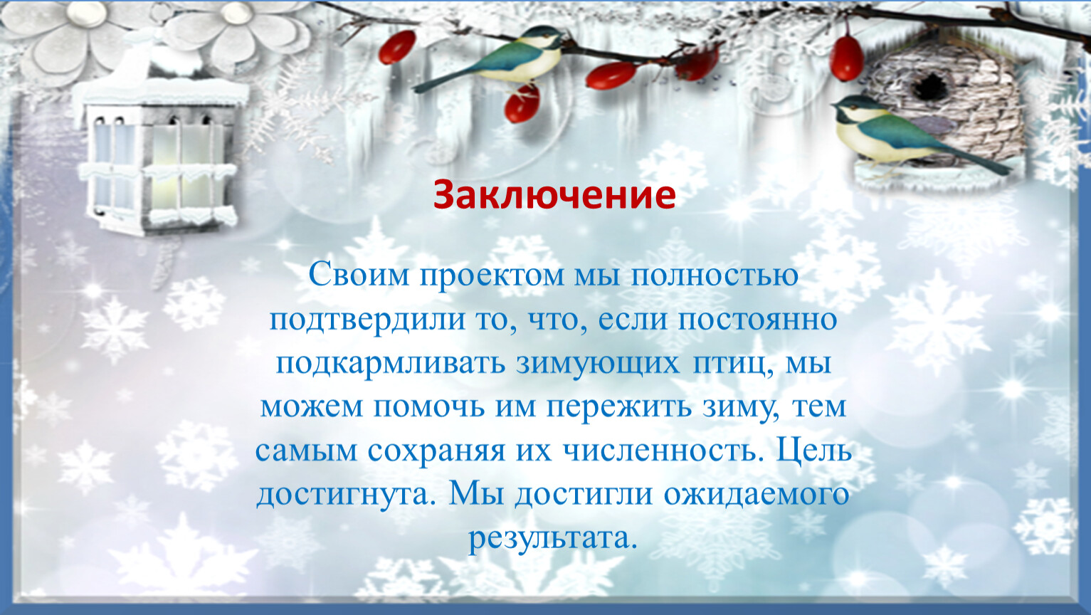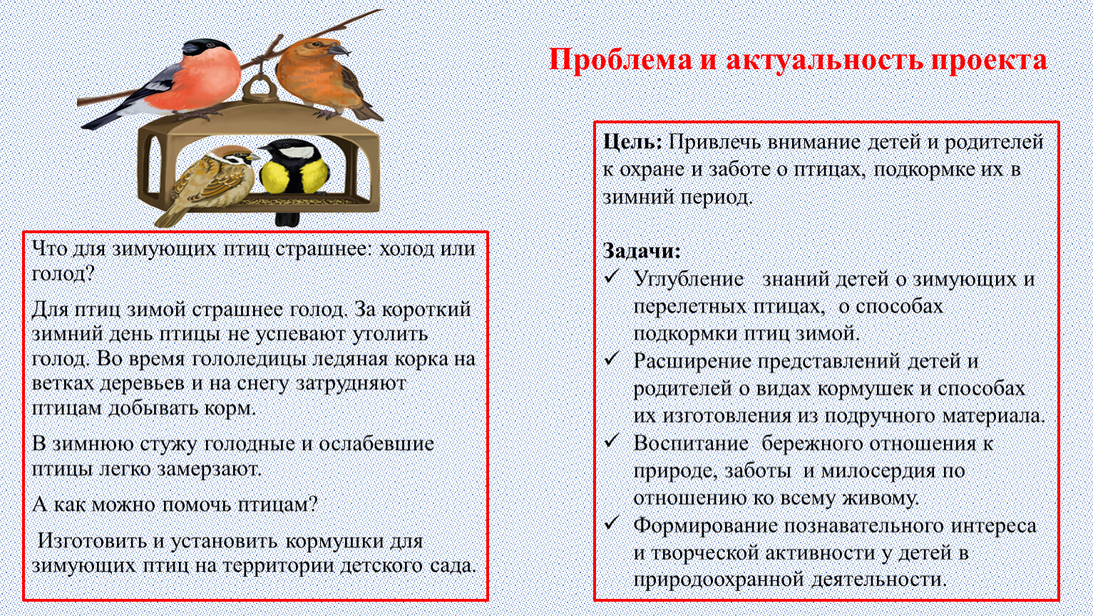 Цель: Привлечь внимание детей и родителей к охране и заботе о птицах, подкормке их в зимний период.