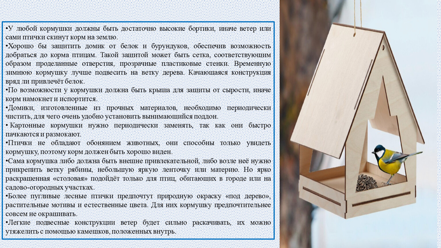 Кормушка должна быть удобной и безопасной. Острые края, торчащие углы и гвозди способны поранить птичку. В деревянных и металлических кормушках нужно все тщательно закрепить и проверить. Достаточно слегка провести пальцем — и все опасные места станут заметны. В картонных, пластиковых, жестяных домиках края и срезы следует заклеить скотчем или пластырем.