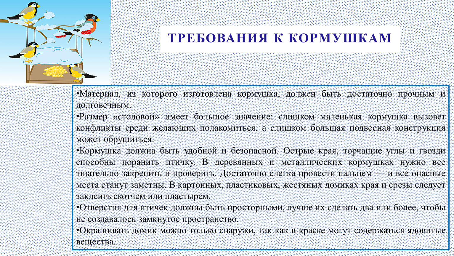 Птички не обладают обонянием животных, они способны только увидеть кормушку, поэтому корм должен быть хорошо виден.