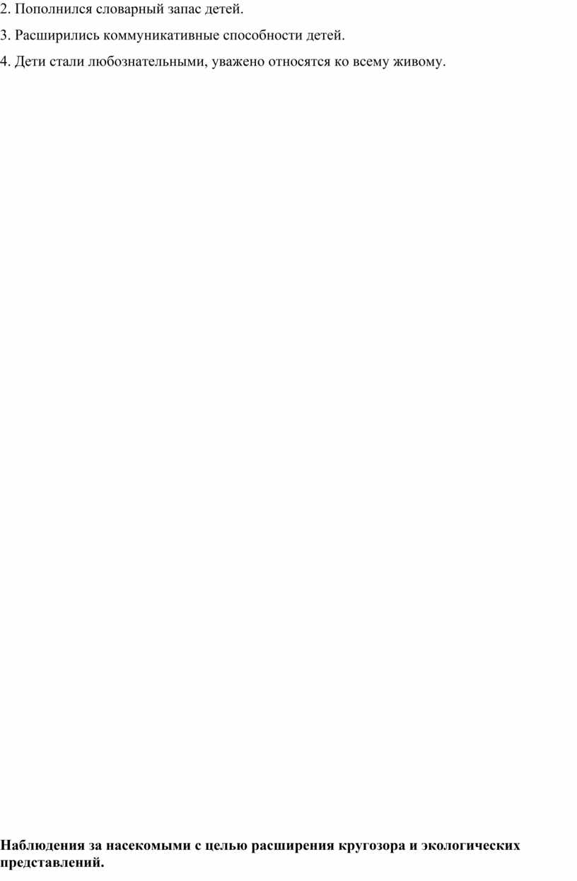 1. У детей сформировалось и обогатилось представление о разнообразии насекомых в природе, представление о различных насекомых, о роли того или иного насекомого в природе.