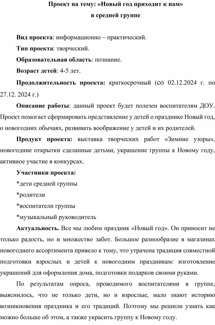 Описание работы: данный проект будет полезен воспитателям ДОУ. Проект помогает сформировать представление у детей о празднике Новый год, о новогодних обычаях, развивать воображение у детей и их родителей.