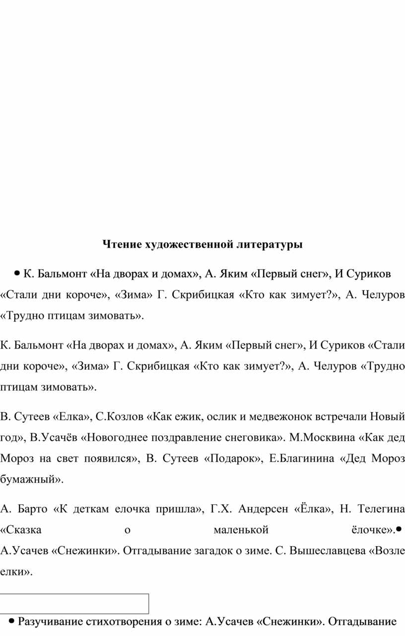 К. Бальмонт «На дворах и домах», А. Яким «Первый снег», И Суриков «Стали дни короче», «Зима» Г. Скрибицкая «Кто как зимует?», А. Челуров «Трудно птицам зимовать». В. Сутеев «Елка», С.Козлов «Как ежик, ослик и медвежонок встречали Новый год», В.Усачёв «Новогоднее поздравление снеговика». М.Москвина «Как дед Мороз на свет появился», В. Сутеев «Подарок», Е.Благинина «Дед Мороз бумажный». А. Барто «К деткам елочка пришла», Г.Х. Андерсен «Ёлка», Н. Телегина «Сказка о маленькой ёлочке». |