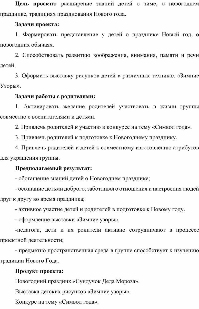 Цель проекта: расширение знаний детей о зиме, о новогоднем празднике, традициях празднования Нового года.