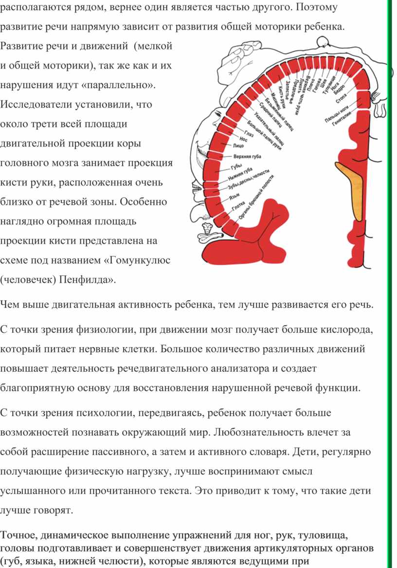 Чем выше двигательная активность ребенка, тем лучше развивается его речь. Взаимосвязь общей и речевой моторики изучена и подтверждена исследованиями многих крупнейших ученых, таких, как И.П. Павлов, А.А. Леонтьев, А.Р. Лурия. Когда ребенок овладевает двигательными умениями и навыками, развивается координация движений. Обучение движениям происходит при участии речи. Точное, динамичное выполнение упражнений для ног, туловища, рук, головы подготавливает совершенствование движений артикулярных органов: губ, языка, нижней челюсти и т.д.