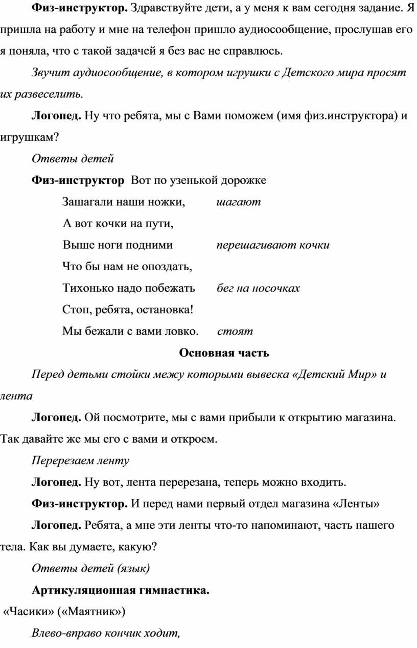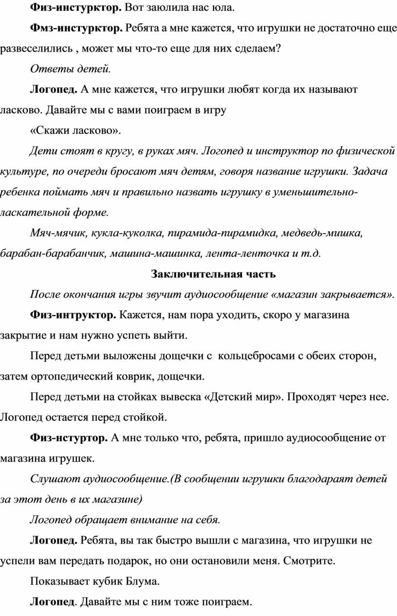 Перед детьми на стойках вывеска «Детский мир». Проходят через нее. Логопед остается перед стойкой.