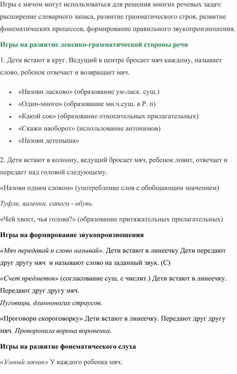Дети стоят в кругу, в руках мяч. Логопед и инструктор по физической культуре, по очереди бросают мяч детям, говоря название игрушки. Задача ребенка поймать мяч и правильно назвать игрушку в уменьшительно-ласкательной форме.