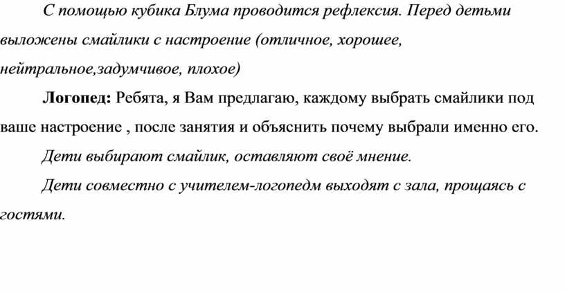 С помощью кубика Блума проводится рефлексия. Перед детьми выложены смайлики с настроение (отличное, хорошее, нейтральное,задумчивое, плохое)