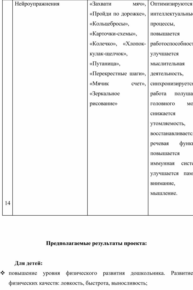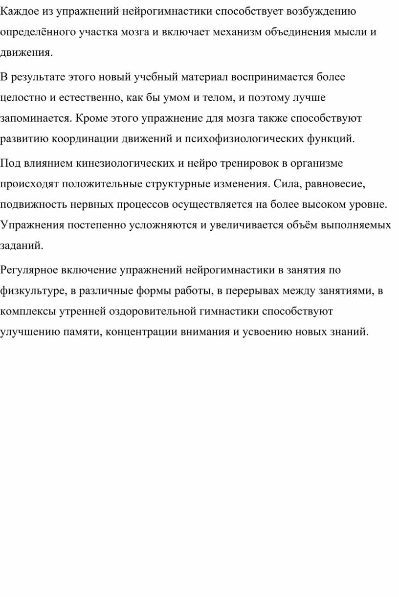 Практическая значимость проекта состоит в том, что с помощью специально подобранных упражнений организм координирует работу правого и левого полушарий и развивает взаимодействие тела и интеллекта. Данный метод коррекции улучшает у ребёнка память, внимание, речь, процессы письма и чтения, пространственные представления, мелкую и крупную моторику, снижает утомляемость, повышает способность к произвольному контролю. Как показывает опыт, образовательную кинезиологию и нейрогимнастику необходимо использовать для коррекции детей, имеющих отклонения в развитии.
