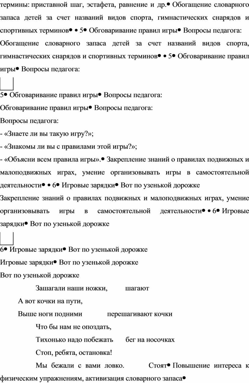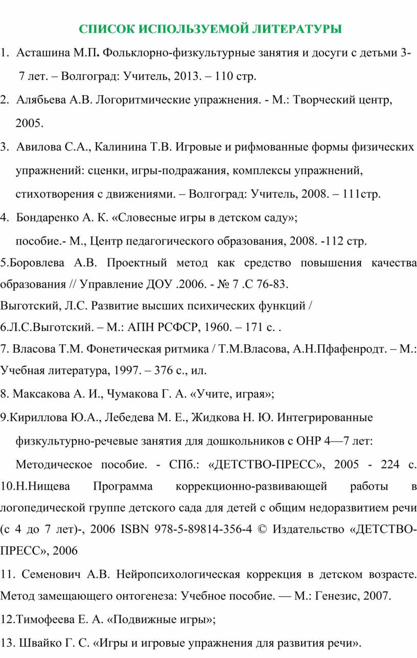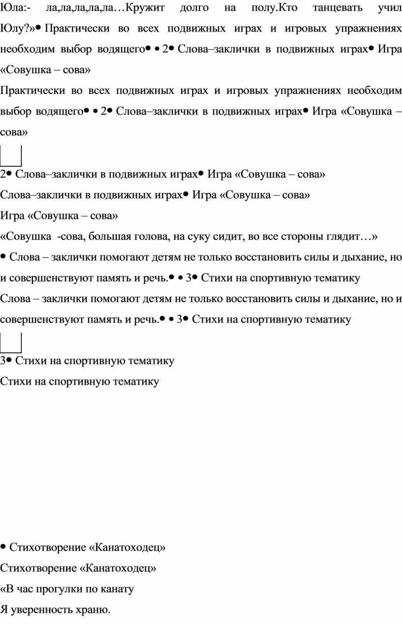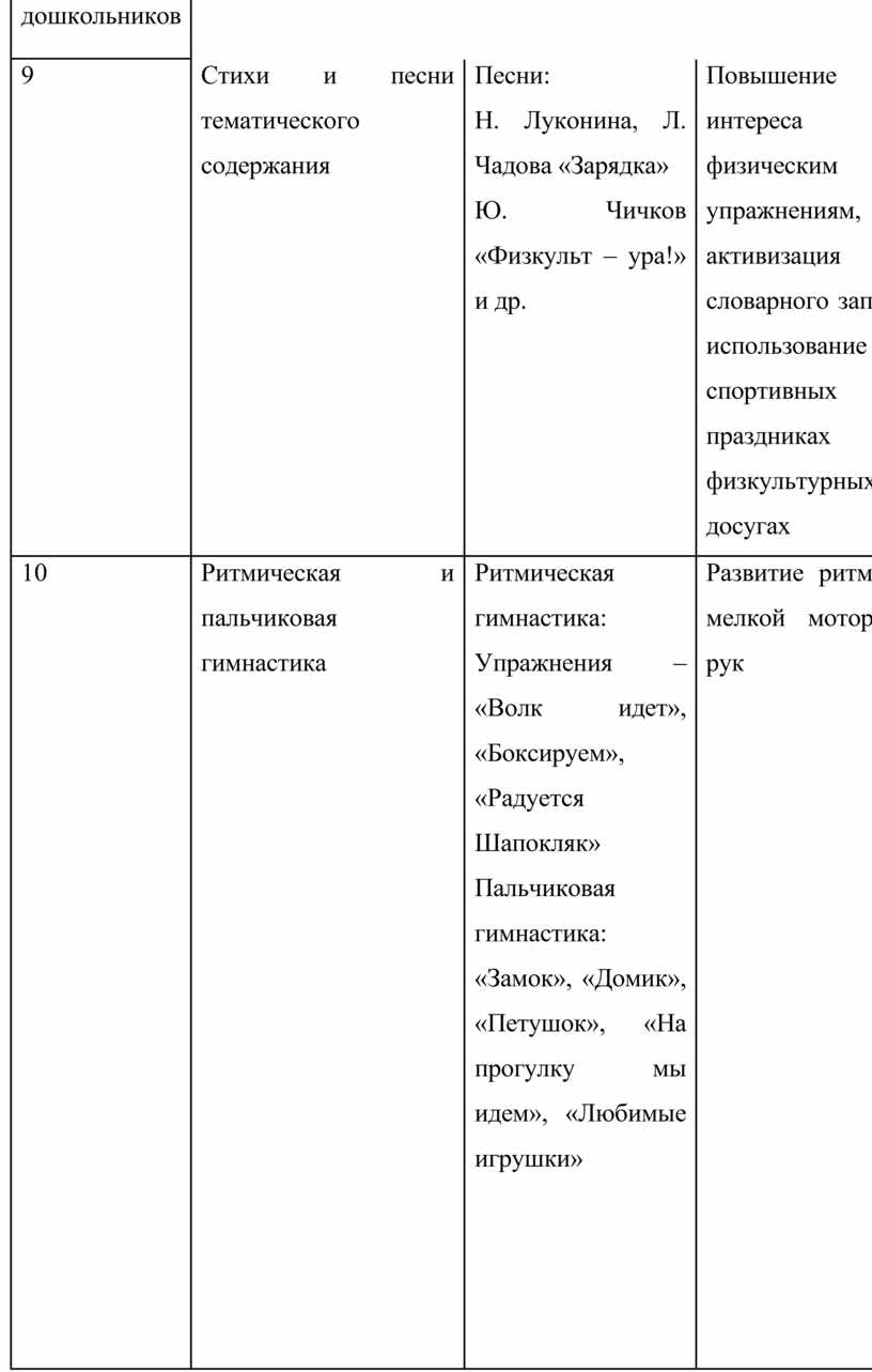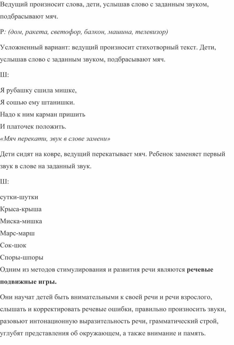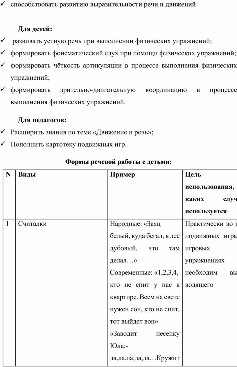 Работа по развитию и обогащению словарного запаса детей включается в любую форму физкультурно-оздоровительных мероприятий с учётом особенностей возраста, здоровья, физического развития дошкольников. Всякая двигательная активность не будет наиболее интересна для ребёнка без использования в утренней гимнастике, на занятиях физкультурой, в подвижных играх, в самостоятельной двигательной деятельности; при выполнении закаливания считалок; словесных игр; без подвижной игры со стихотворным текстом.