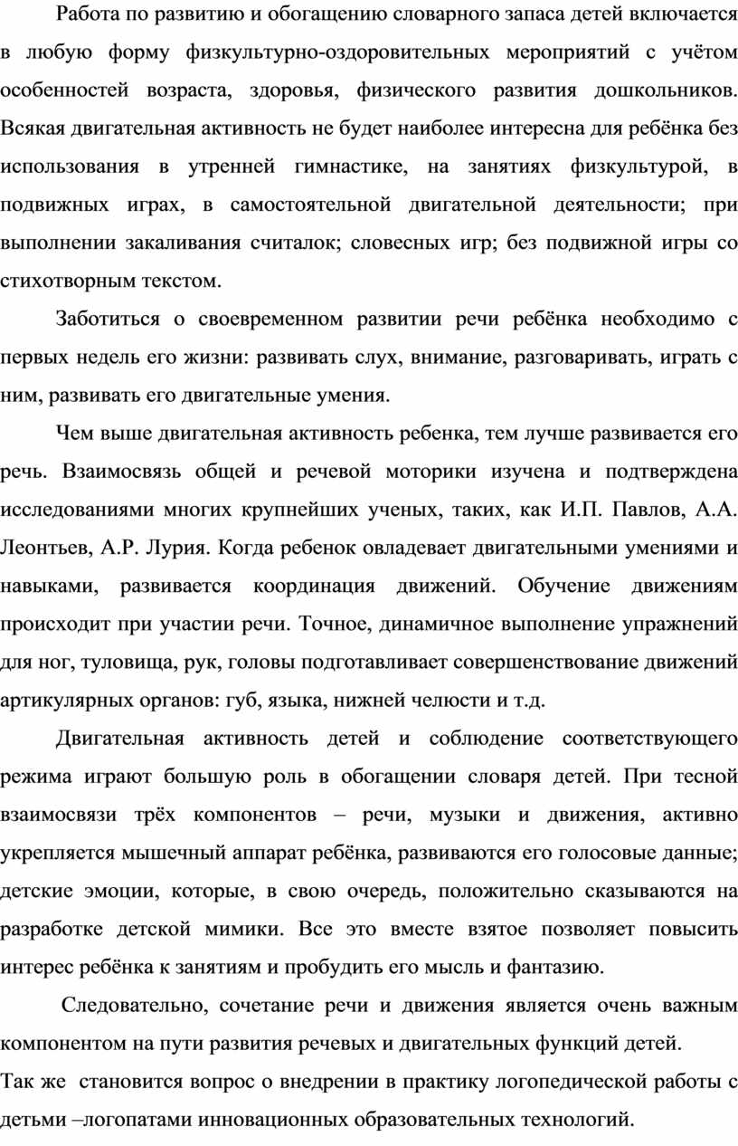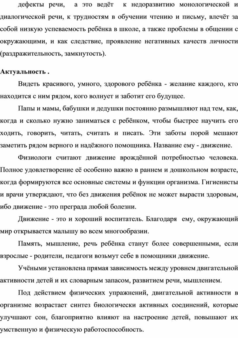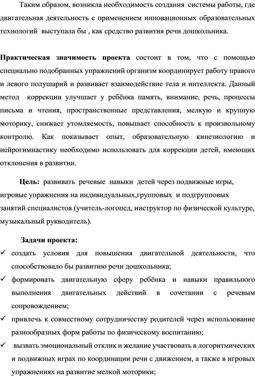 Таким образом, возникла необходимость создания системы работы, где двигательная деятельность с применением инновационных образовательных технологий выступала бы , как средство развития речи дошкольника.