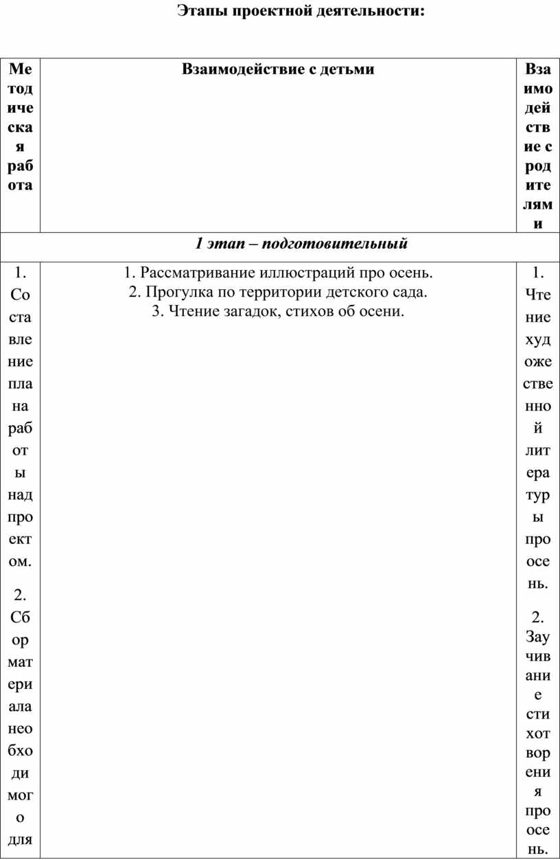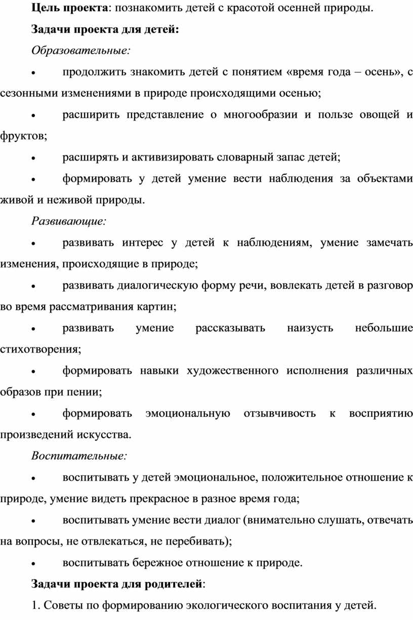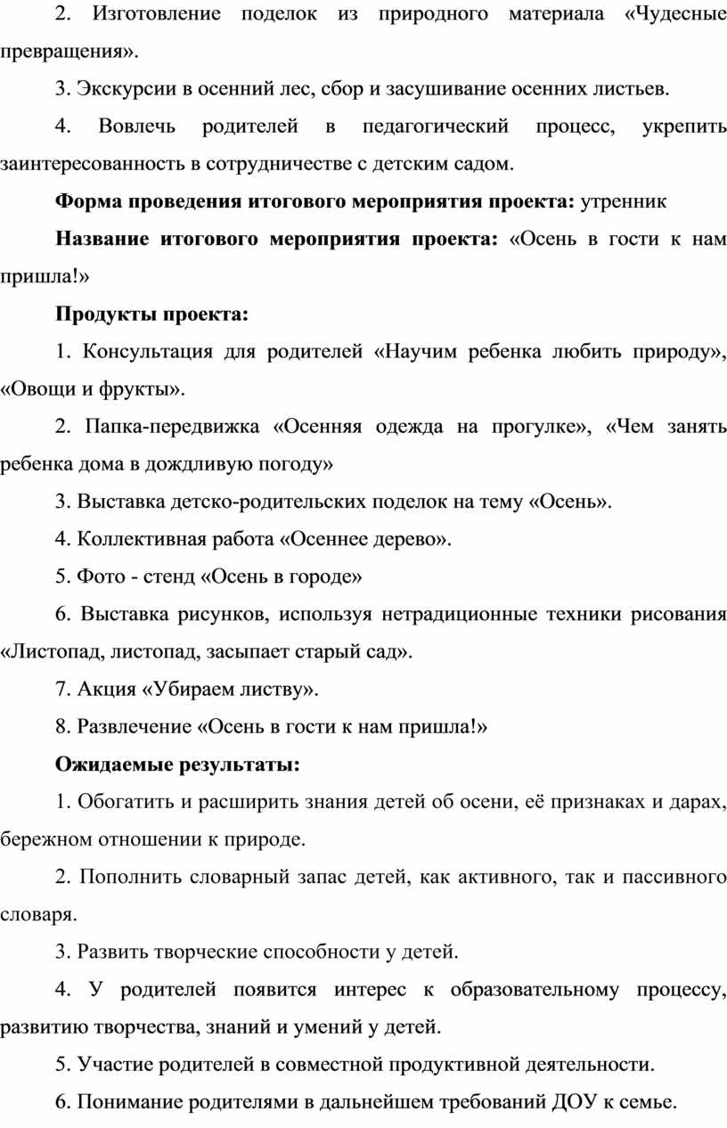 Участие детей в этом проекте позволит ознакомить их с представлением об осени — как времени года, её характерных признаках, развить творческие способности, поисковую деятельность, связную речь.