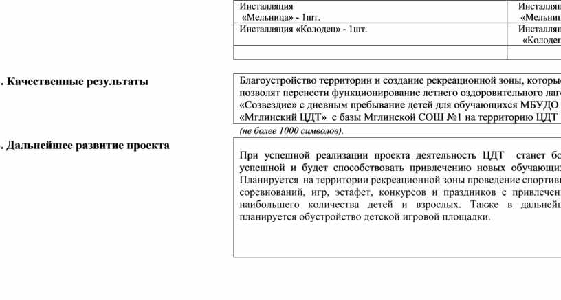 Благоустройство территории и создание рекреационной зоны, которые позволят перенести функционирование летнего оздоровительного лагеря «Созвездие» с дневным пребывание детей для обучающихся МБУДО «Мглинский ЦДТ» с базы Мглинской СОШ №1 на территорию ЦДТ |
