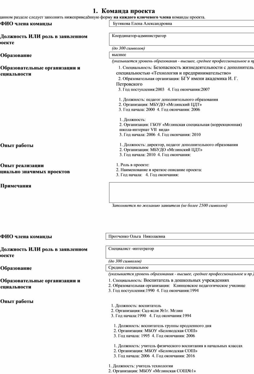 В данном разделе следует заполнить нижеприведённую форму на каждого ключевого члена команды проекта. |