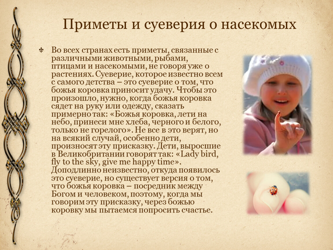 Во всех странах есть приметы, связанные с различными животными, рыбами, птицами и насекомыми, не говоря уже о растениях. Суеверие, которое известно всем с самого детства – это суеверие о том, что божья коровка приносит удачу. Чтобы это произошло, нужно, когда божья коровка сядет на руку или одежду, сказать примерно так: «Божья коровка, лети на небо, принеси мне хлеба, черного и белого, только не горелого». Не все в это верят, но на всякий случай, особенно дети, произносят эту присказку. Дети, выросшие в Великобритании говорят так: «Lady bird, fly to the sky, give me happy time». Доподлинно неизвестно, откуда появилось это суеверие, но существует версия о том, что божья коровка – посредник между Богом и человеком, поэтому, когда мы говорим эту присказку, через божью коровку мы пытаемся попросить счастье.