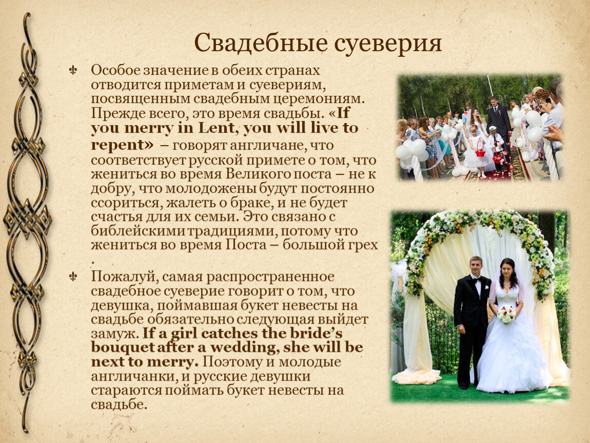 Особое значение в обеих странах отводится приметам и суевериям, посвященным свадебным церемониям. Прежде всего, это время свадьбы. «If you merry in Lent, you will live to repent» – говорят англичане, что соответствует русской примете о том, что жениться во время Великого поста – не к добру, что молодожены будут постоянно ссориться, жалеть о браке, и не будет счастья для их семьи. Это связано с библейскими традициями, потому что жениться во время Поста – большой грех .