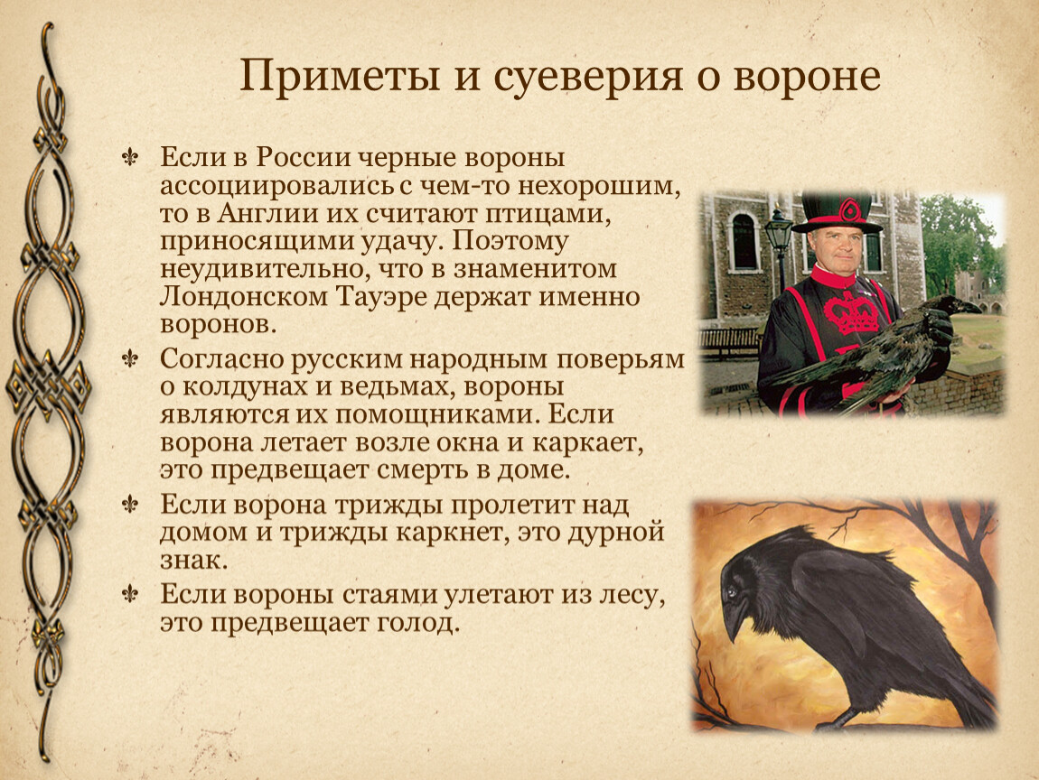 Согласно русским народным поверьям о колдунах и ведьмах, вороны являются их помощниками. Если ворона летает возле окна и каркает, это предвещает смерть в доме.