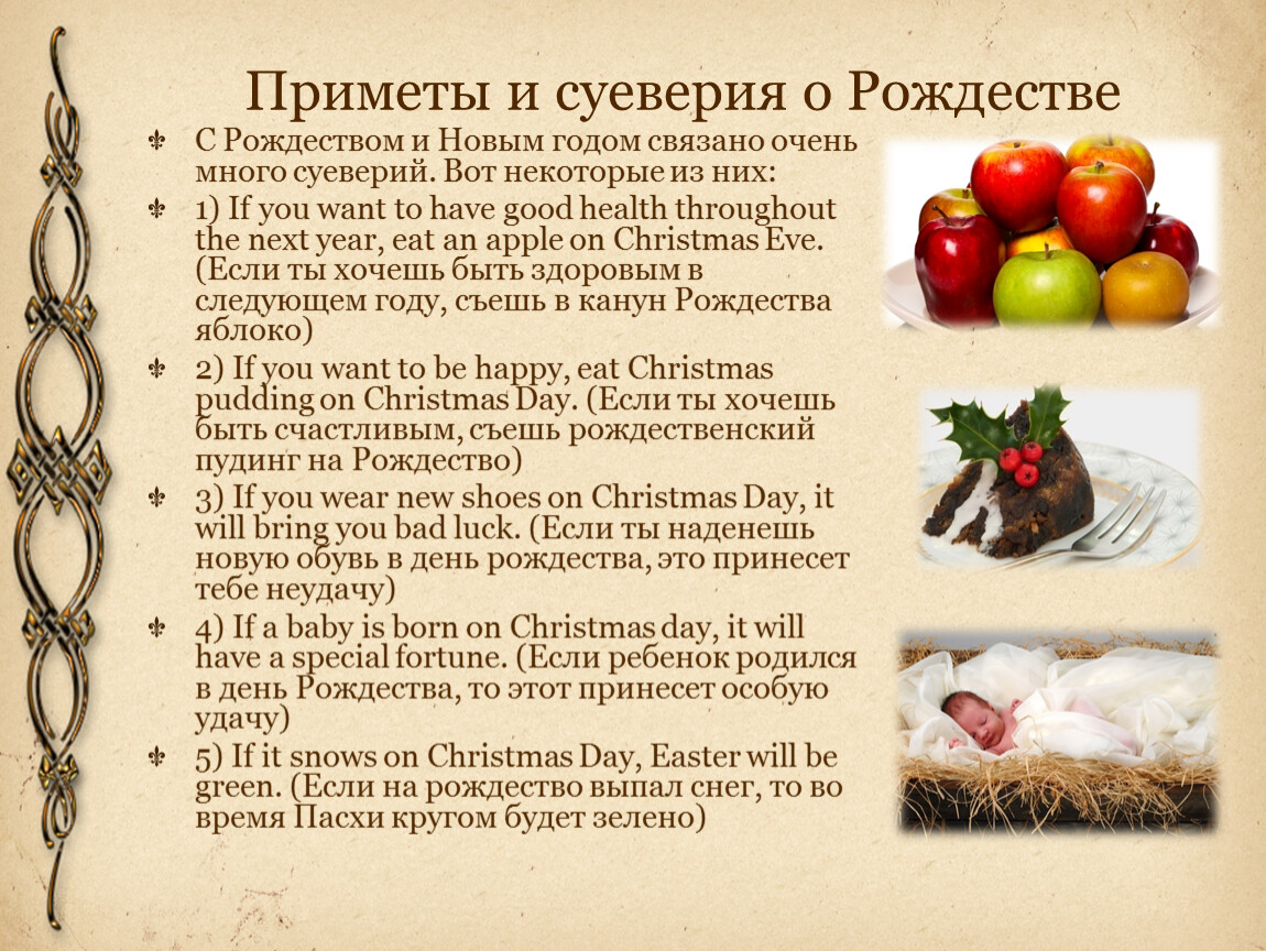 4) If a baby is born on Christmas day, it will have a special fortune. (Если ребенок родился в день Рождества, то этот принесет особую удачу)