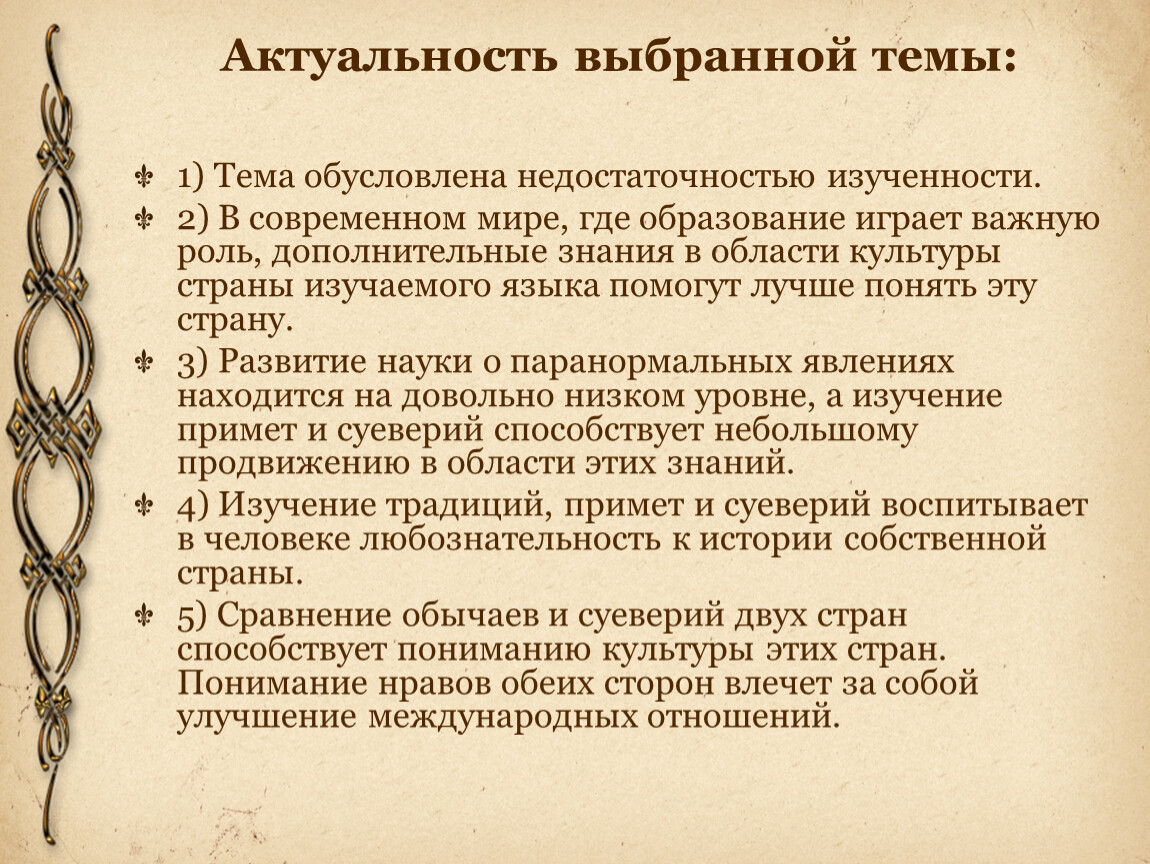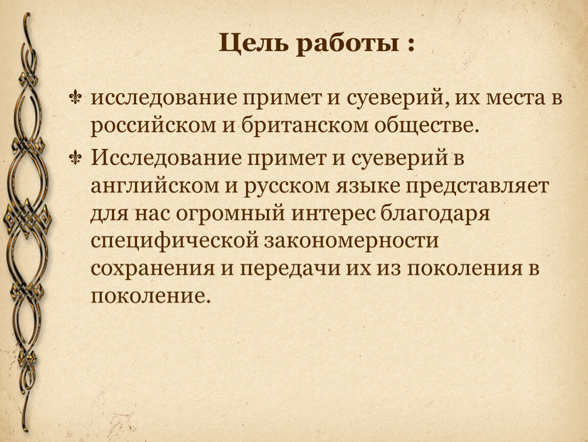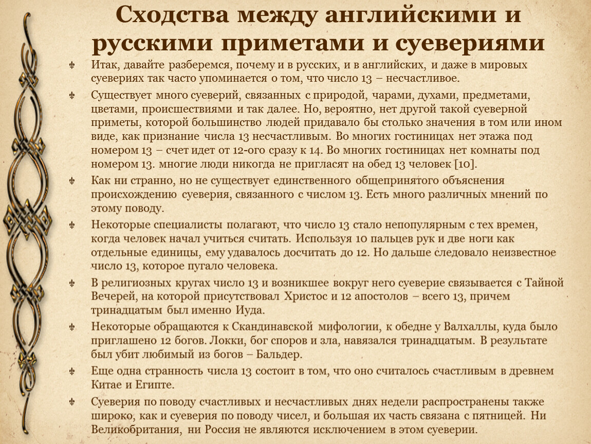Исследование примет и суеверий в английском и русском языке представляет для нас огромный интерес благодаря специфической закономерности сохранения и передачи их из поколения в поколение.
