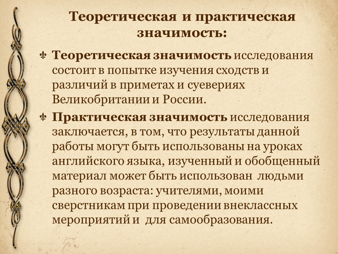 Теоретическая значимость исследования состоит в попытке изучения сходств и различий в приметах и суевериях Великобритании и России.