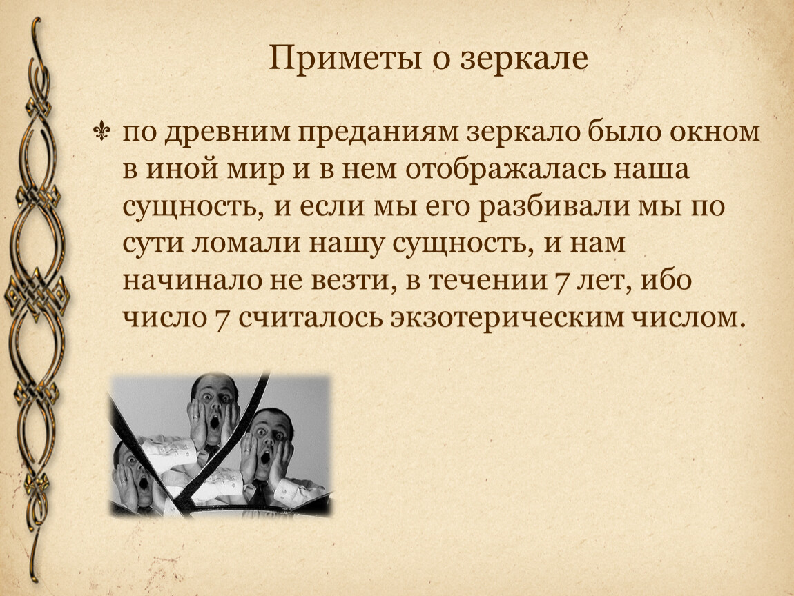 по древним преданиям зеркало было окном в иной мир и в нем отображалась наша сущность, и если мы его разбивали мы по сути ломали нашу сущность, и нам начинало не везти, в течении 7 лет, ибо число 7 считалось экзотерическим числом.