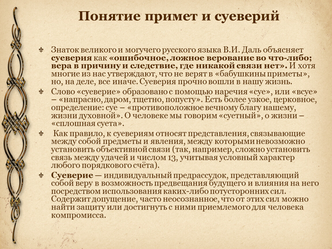 Знаток великого и могучего русского языка В.И. Даль объясняет суеверия как «ошибочное, ложное верование во что-либо; вера в причину и следствие, где никакой связи нет». И хотя многие из нас утверждают, что не верят в «бабушкины приметы», но, на деле, все иначе. Суеверия прочно вошли в нашу жизнь.