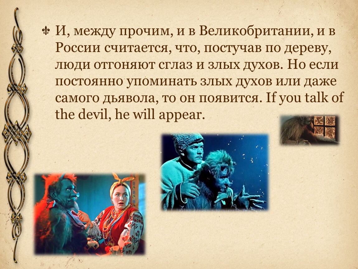 И, между прочим, и в Великобритании, и в России считается, что, постучав по дереву, люди отгоняют сглаз и злых духов. Но если постоянно упоминать злых духов или даже самого дьявола, то он появится. If you talk of the devil, he will appear.