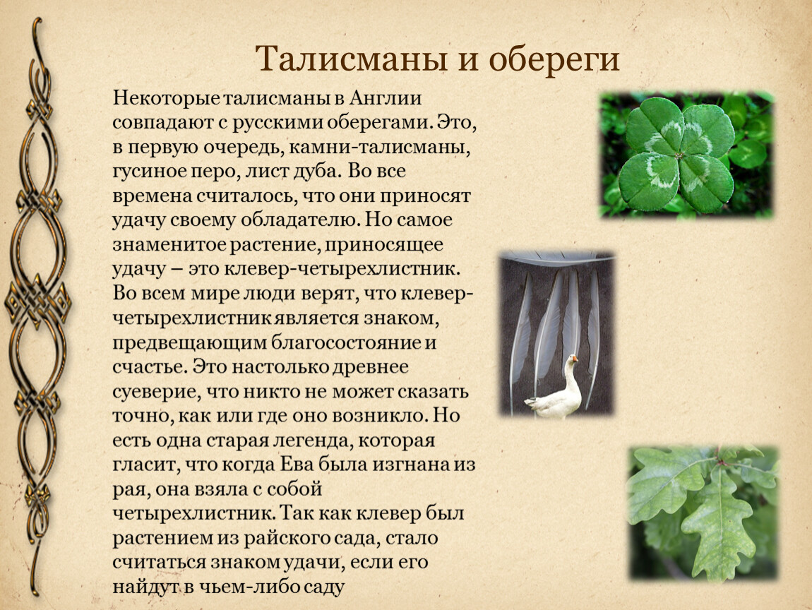 Некоторые талисманы в Англии совпадают с русскими оберегами. Это, в первую очередь, камни-талисманы, гусиное перо, лист дуба. Во все времена считалось, что они приносят удачу своему обладателю. Но самое знаменитое растение, приносящее удачу – это клевер-четырехлистник. Во всем мире люди верят, что клевер-четырехлистник является знаком, предвещающим благосостояние и счастье. Это настолько древнее суеверие, что никто не может сказать точно, как или где оно возникло. Но есть одна старая легенда, которая гласит, что когда Ева была изгнана из рая, она взяла с собой четырехлистник. Так как клевер был растением из райского сада, стало считаться знаком удачи, если его найдут в чьем-либо саду