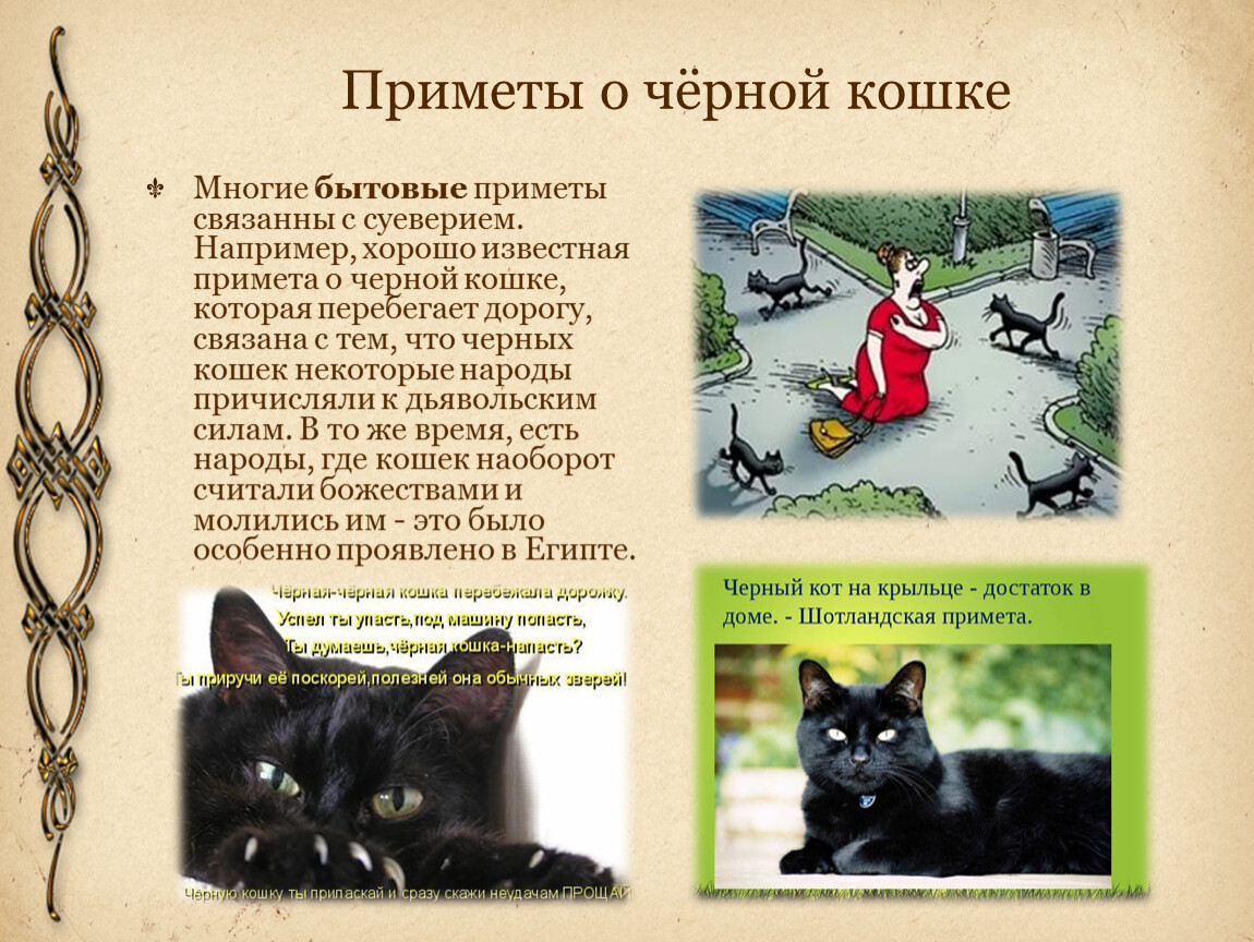 Когда люди верили в существование ведьм, они ассоциировали черную кошку с ведьмой. Они верили, что черные кошки являлись замаскированными ведьмами. Убить кошку не значило убить ведьму, так как ведьма могла принять вид кошки девять раз. Именно отсюда пошел миф о том, что у кошек девять жизней. В средние века верили, что ведьмы и колдуны использовали мозг черной кошки для приготовления таинственного зелья. Вследствие всех этих ассоциаций черная кошка в России и многих других странах стала символом неудачи.