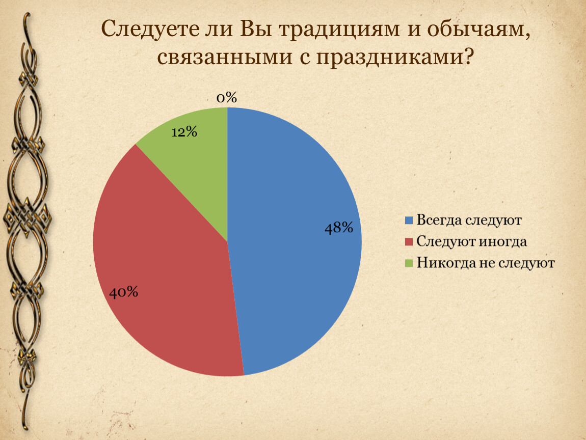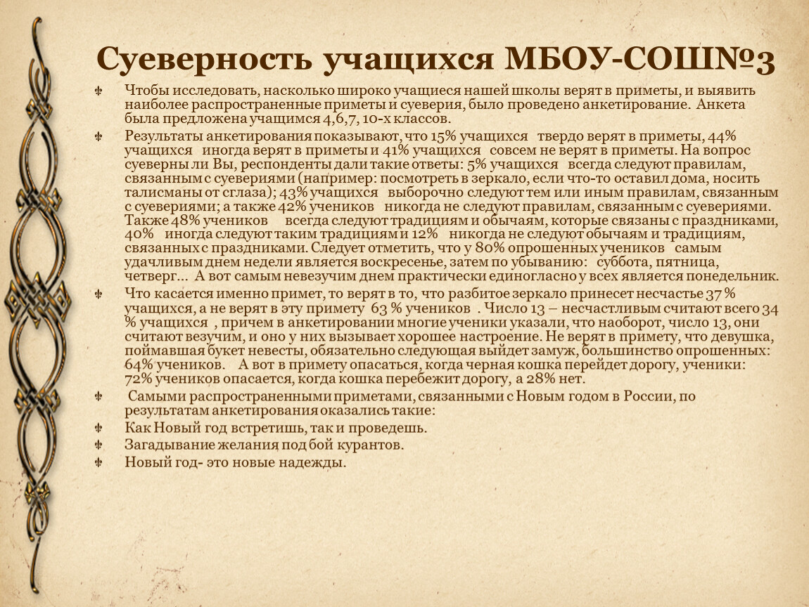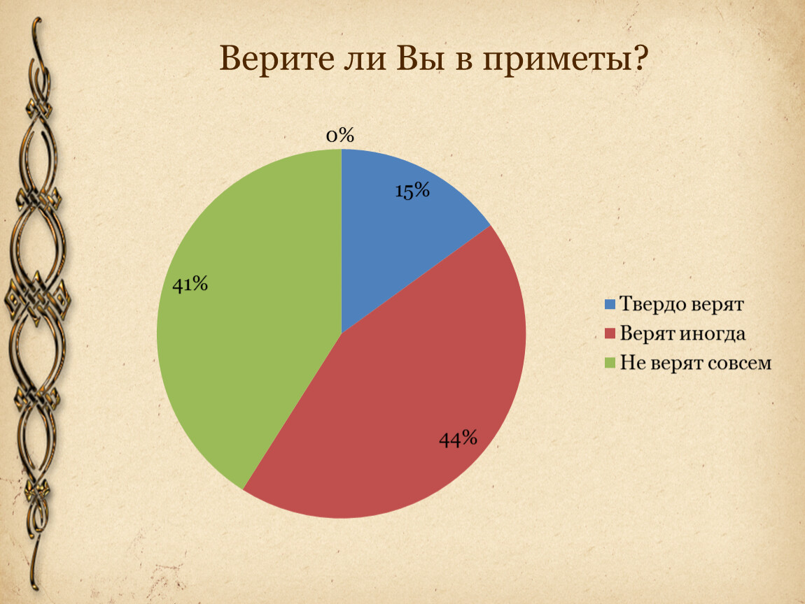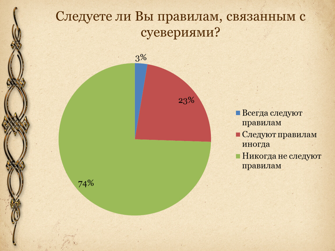 Результаты анкетирования показывают, что 15% учащихся твердо верят в приметы, 44% учащихся иногда верят в приметы и 41% учащихся совсем не верят в приметы. На вопрос суеверны ли Вы, респонденты дали такие ответы: 5% учащихся всегда следуют правилам, связанным с суевериями (например: посмотреть в зеркало, если что-то оставил дома, носить талисманы от сглаза); 43% учащихся выборочно следуют тем или иным правилам, связанным с суевериями; а также 42% учеников никогда не следуют правилам, связанным с суевериями. Также 48% учеников всегда следуют традициям и обычаям, которые связаны с праздниками, 40% иногда следуют таким традициям и 12% никогда не следуют обычаям и традициям, связанных с праздниками. Следует отметить, что у 80% опрошенных учеников самым удачливым днем недели является воскресенье, затем по убыванию: суббота, пятница, четверг… А вот самым невезучим днем практически единогласно у всех является понедельник.