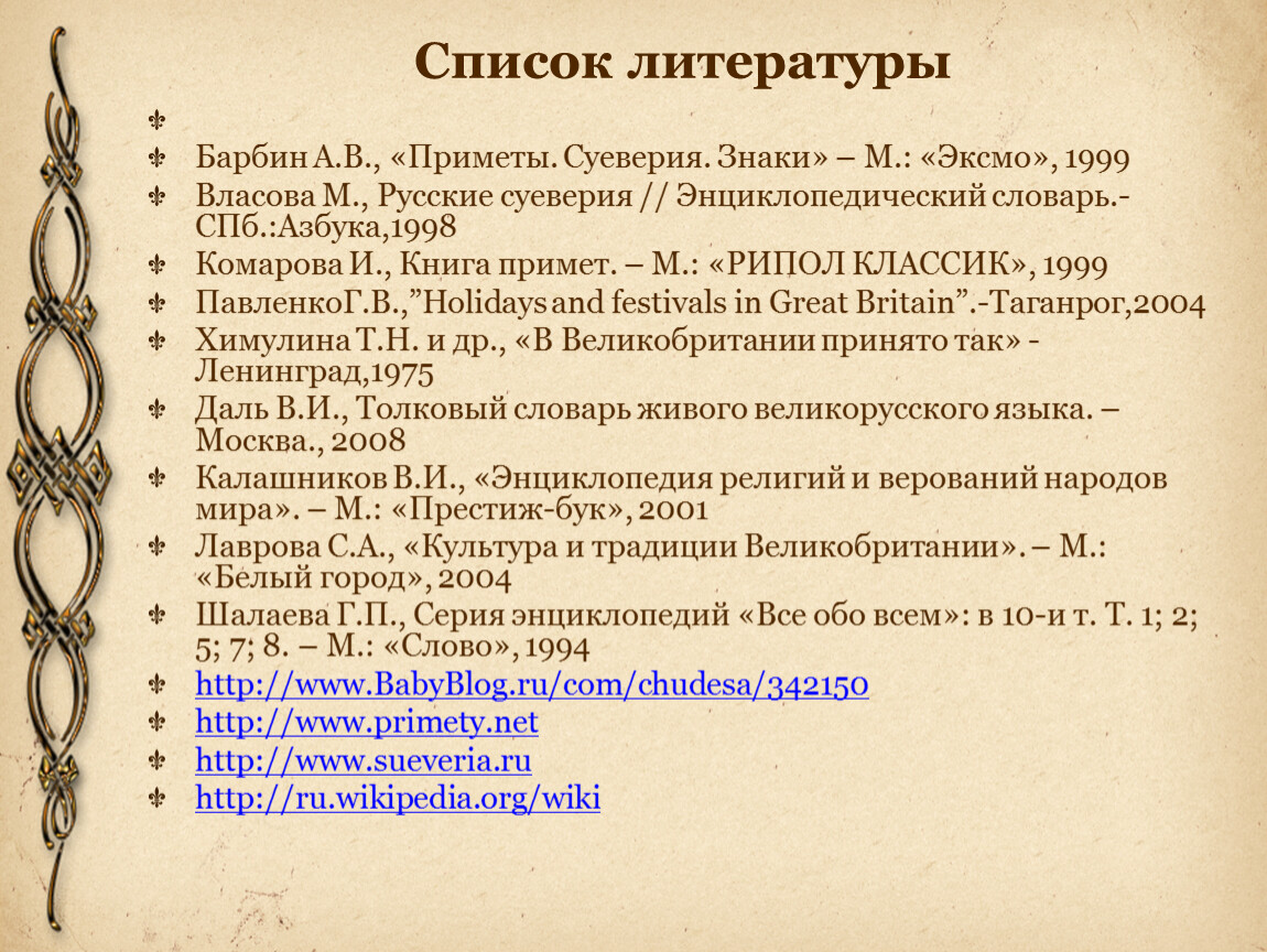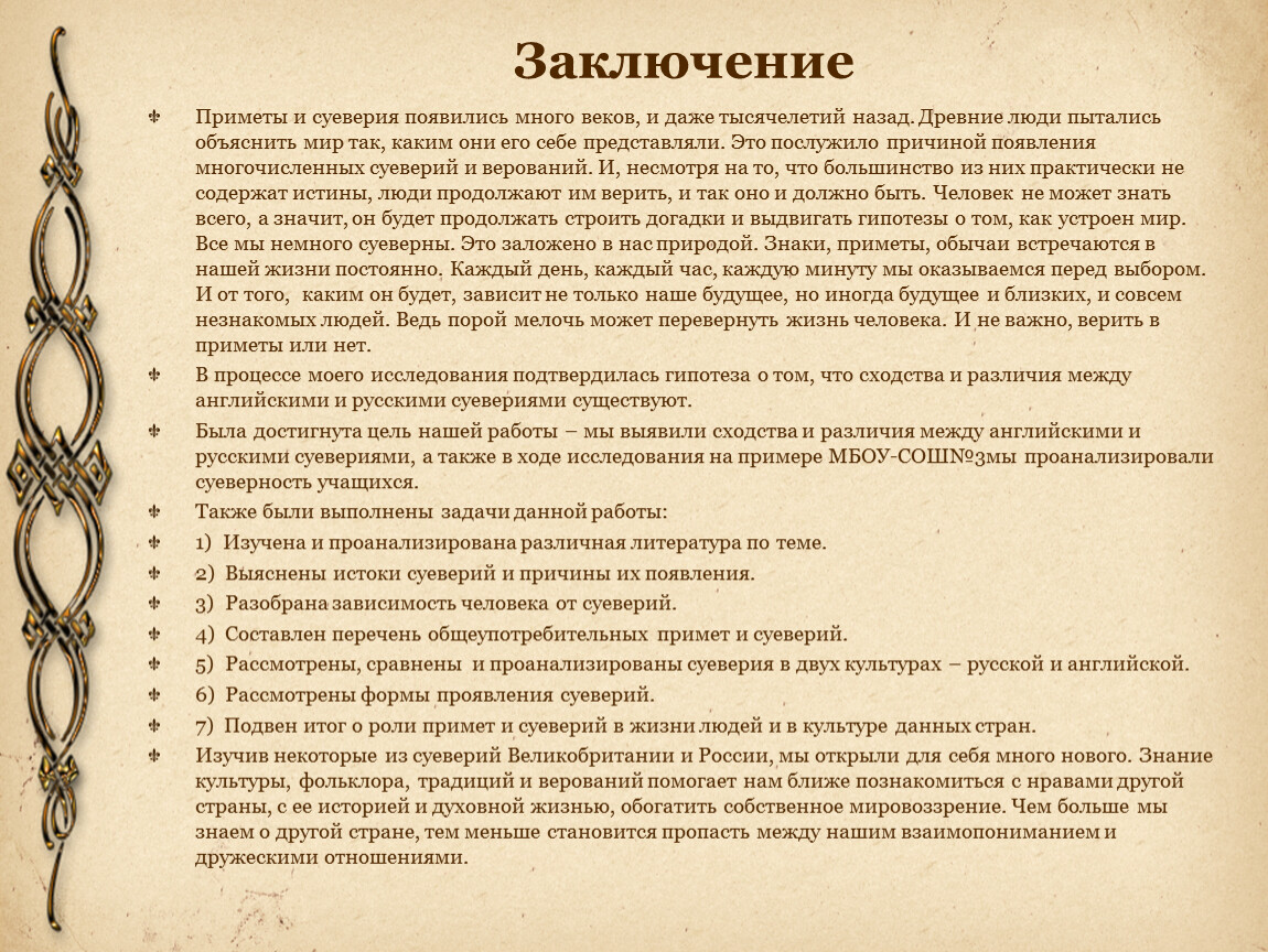 Изучив некоторые из суеверий Великобритании и России, мы открыли для себя много нового. Знание культуры, фольклора, традиций и верований помогает нам ближе познакомиться с нравами другой страны, с ее историей и духовной жизнью, обогатить собственное мировоззрение. Чем больше мы знаем о другой стране, тем меньше становится пропасть между нашим взаимопониманием и дружескими отношениями.