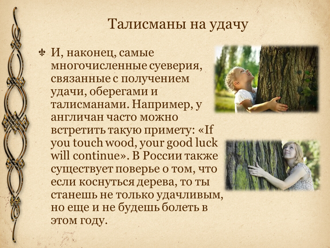 И, наконец, самые многочисленные суеверия, связанные с получением удачи, оберегами и талисманами. Например, у англичан часто можно встретить такую примету: «If you touch wood, your good luck will continue». В России также существует поверье о том, что если коснуться дерева, то ты станешь не только удачливым, но еще и не будешь болеть в этом году.