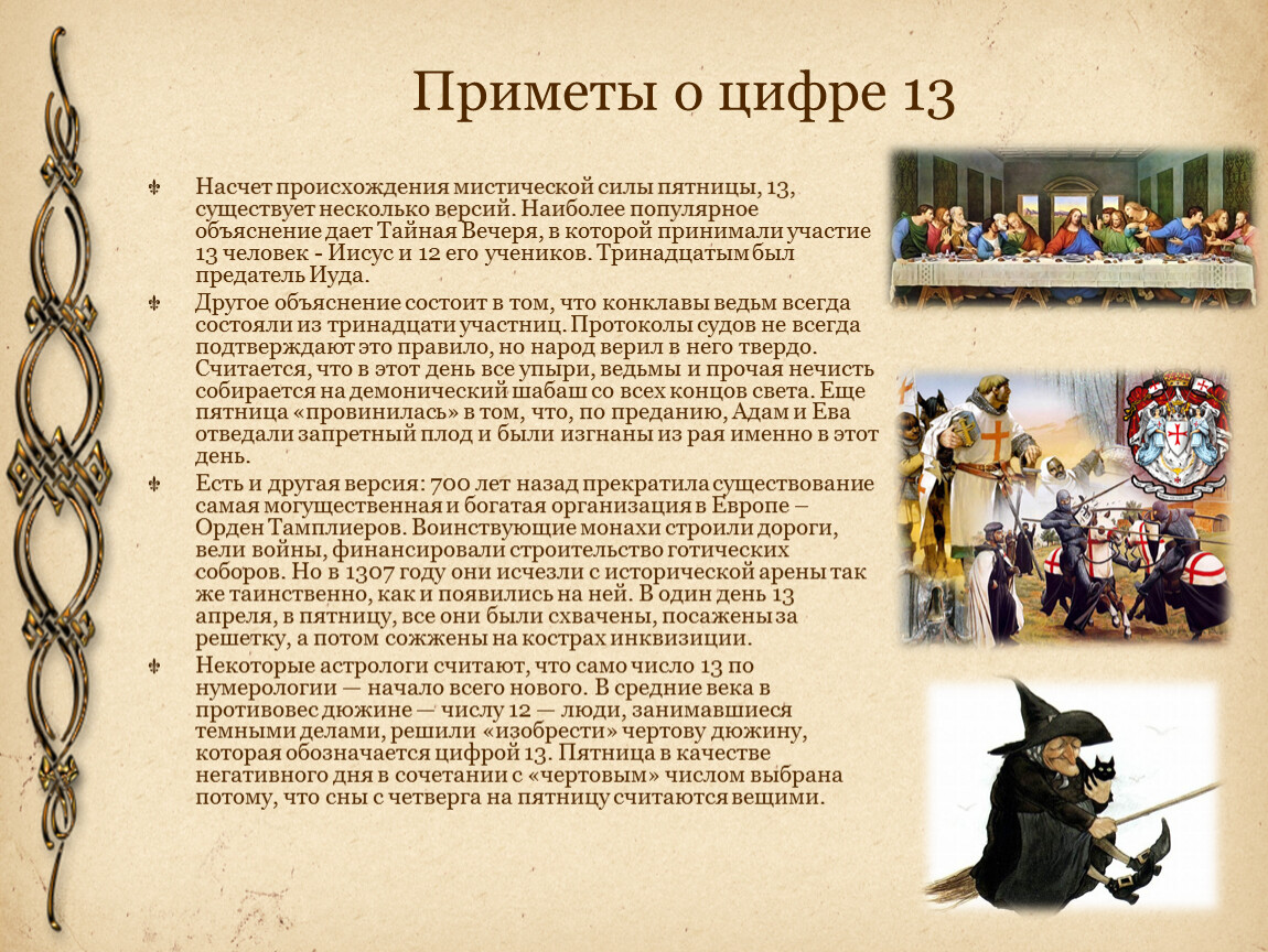 В религиозных кругах число 13 и возникшее вокруг него суеверие связывается с Тайной Вечерей, на которой присутствовал Христос и 12 апостолов – всего 13, причем тринадцатым был именно Иуда.