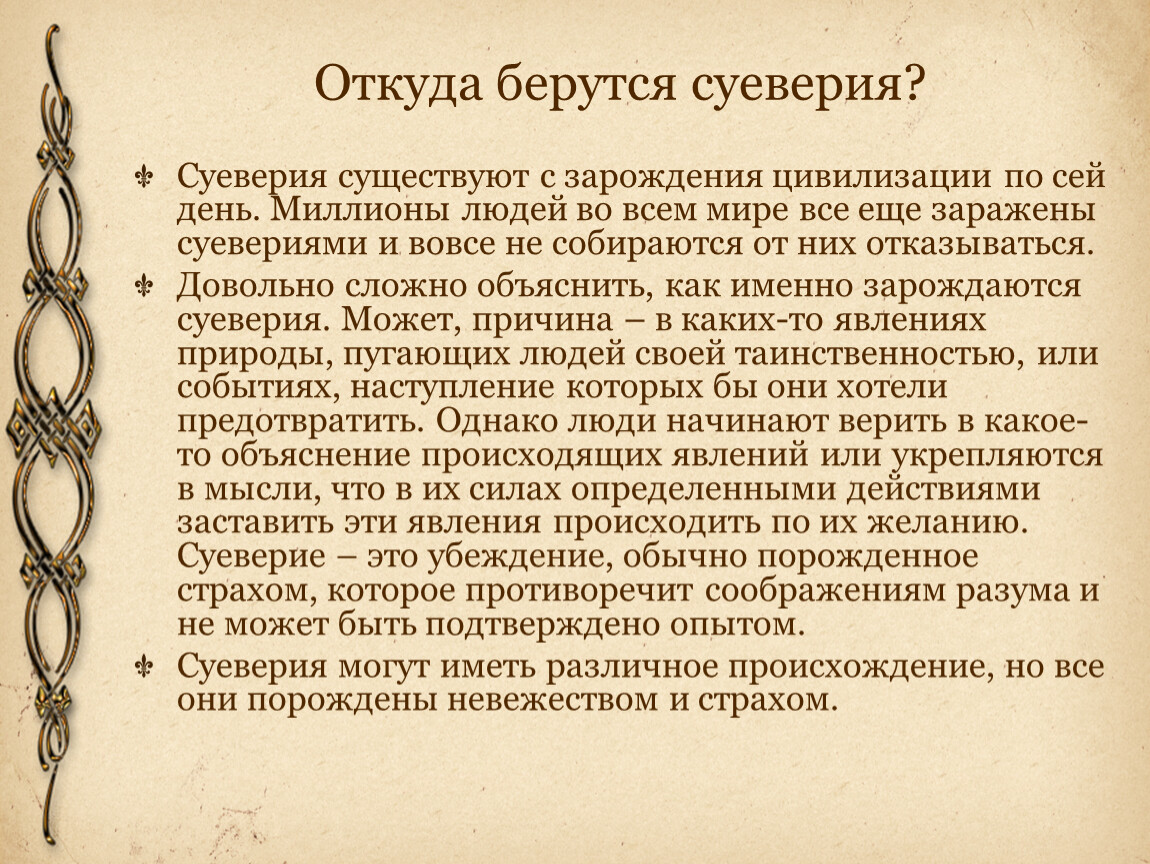 Суеверия могут иметь различное происхождение, но все они порождены невежеством и страхом.