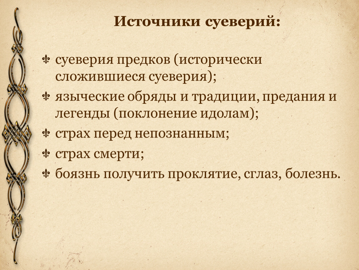 Довольно сложно объяснить, как именно зарождаются суеверия. Может, причина – в каких-то явлениях природы, пугающих людей своей таинственностью, или событиях, наступление которых бы они хотели предотвратить. Однако люди начинают верить в какое-то объяснение происходящих явлений или укрепляются в мысли, что в их силах определенными действиями заставить эти явления происходить по их желанию. Суеверие – это убеждение, обычно порожденное страхом, которое противоречит соображениям разума и не может быть подтверждено опытом.