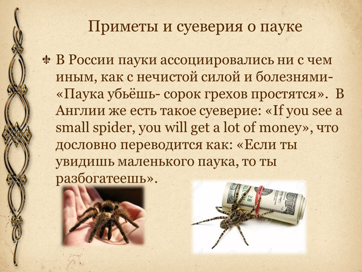 В России пауки ассоциировались ни с чем иным, как с нечистой силой и болезнями- «Паука убьёшь- сорок грехов простятся». В Англии же есть такое суеверие: «If you see a small spider, you will get a lot of money», что дословно переводится как: «Если ты увидишь маленького паука, то ты разбогатеешь».