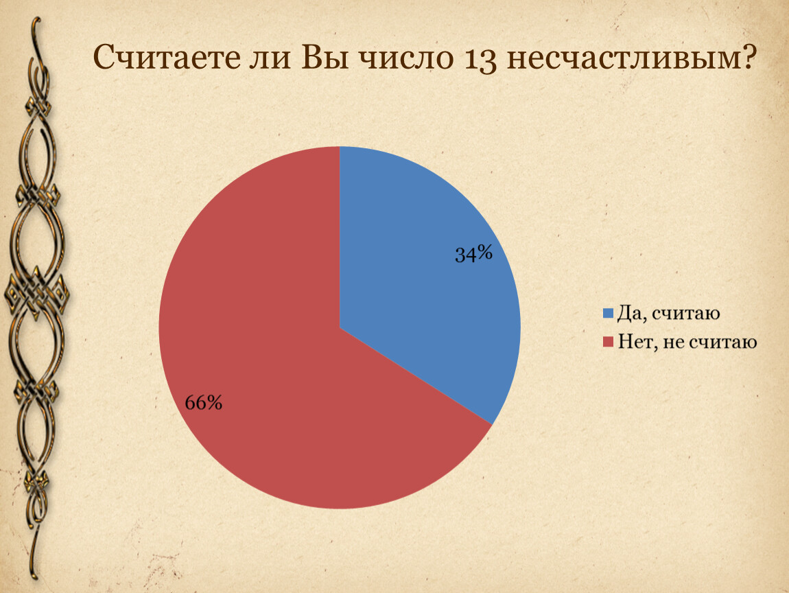 Существует много суеверий, связанных с природой, чарами, духами, предметами, цветами, происшествиями и так далее. Но, вероятно, нет другой такой суеверной приметы, которой большинство людей придавало бы столько значения в том или ином виде, как признание числа 13 несчастливым. Во многих гостиницах нет этажа под номером 13 – счет идет от 12-ого сразу к 14. Во многих гостиницах нет комнаты под номером 13. многие люди никогда не пригласят на обед 13 человек [10].