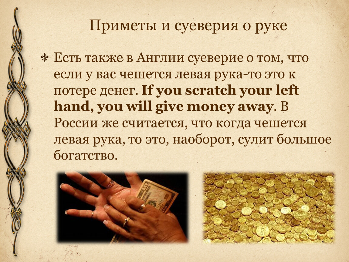 Есть также в Англии суеверие о том, что если у вас чешется левая рука-то это к потере денег. If you scratch your left hand, you will give money away. В России же считается, что когда чешется левая рука, то это, наоборот, сулит большое богатство.